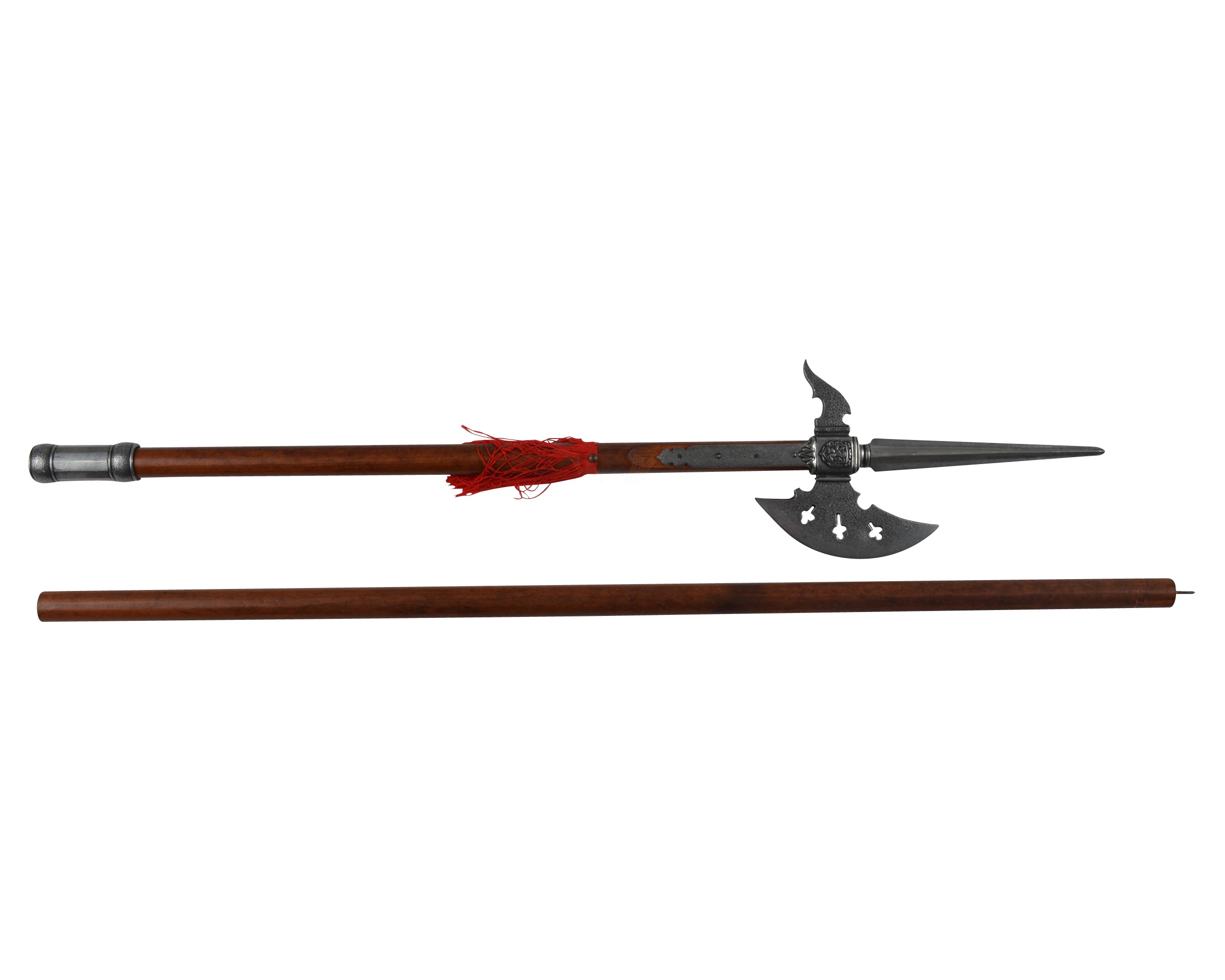 Макет алебарда германская от испанского бренда Denix изготовлена очень качественно – взяв в руки такой сувенирный экземпляр, вы обязательно ощутите трепет от обладания столь эффективным и грозным холодным оружием. Габариты и вес алебарды от Denix соответствуют боевому прототипу – длина оружия составляет 220 см, вес – 1,95 кг. Для лезвия со сквозными фигурными отверстиями использован специальный металлический сплав, из него же выполнен и фигурный обух. И лезвие топора, и острие копья не заточены, так что угрозы не представляют. Древко изготовлено из натурального дерева, как и у боевого аналога, и окрашено в красный цвет.