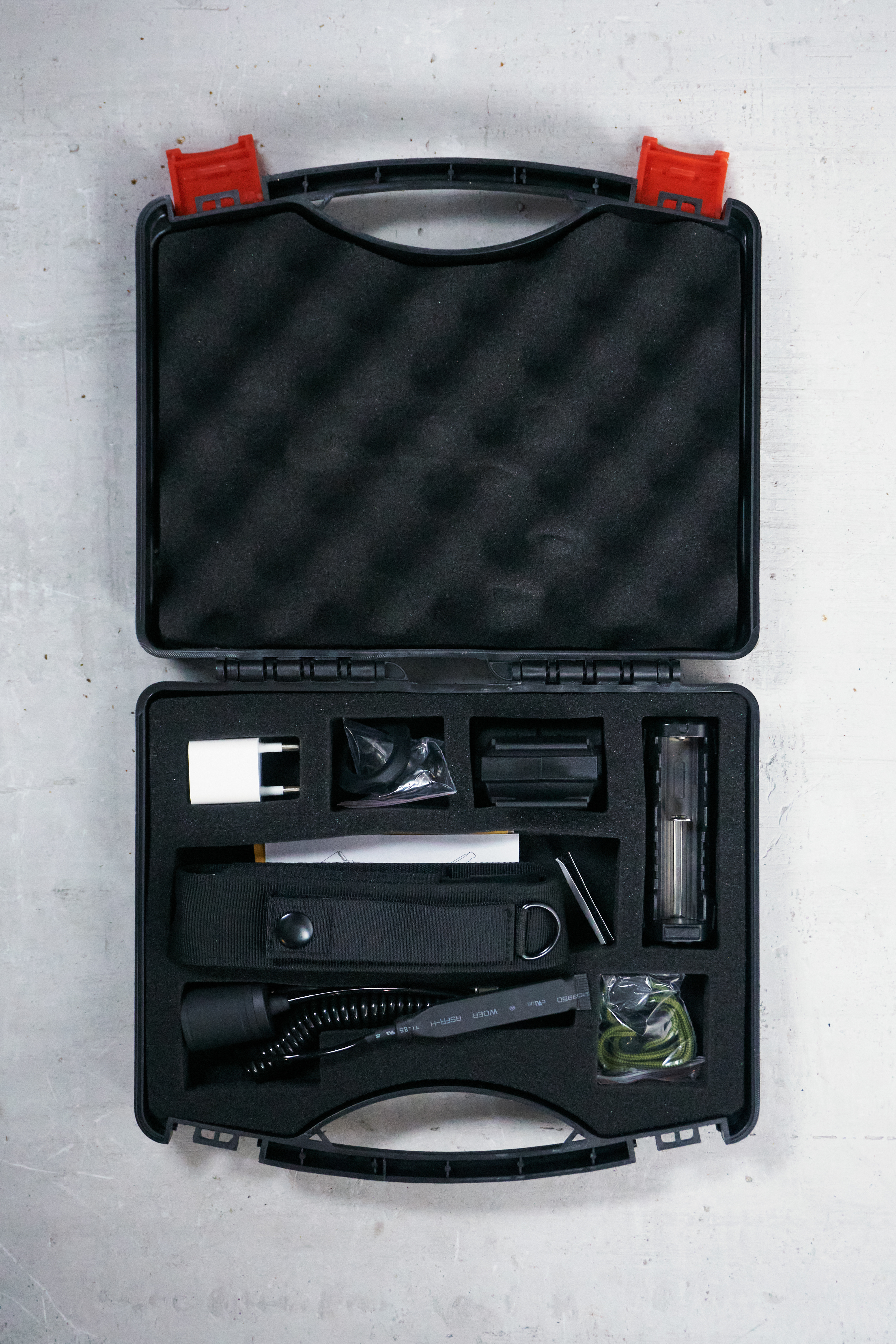 Фонарь с аккумулятором, быстросъемное магнитное крепление на оружие, выносная кнопка с витым шнуром и зарядное устройство с функцией Powerbank поставляются в прочном пластиковом кейсе, который удобно возить с собой. Нейлоновый чехол, стальная клипса и ремешок на руку обеспечивают комфортное повседневное ношение и применение фонаря.