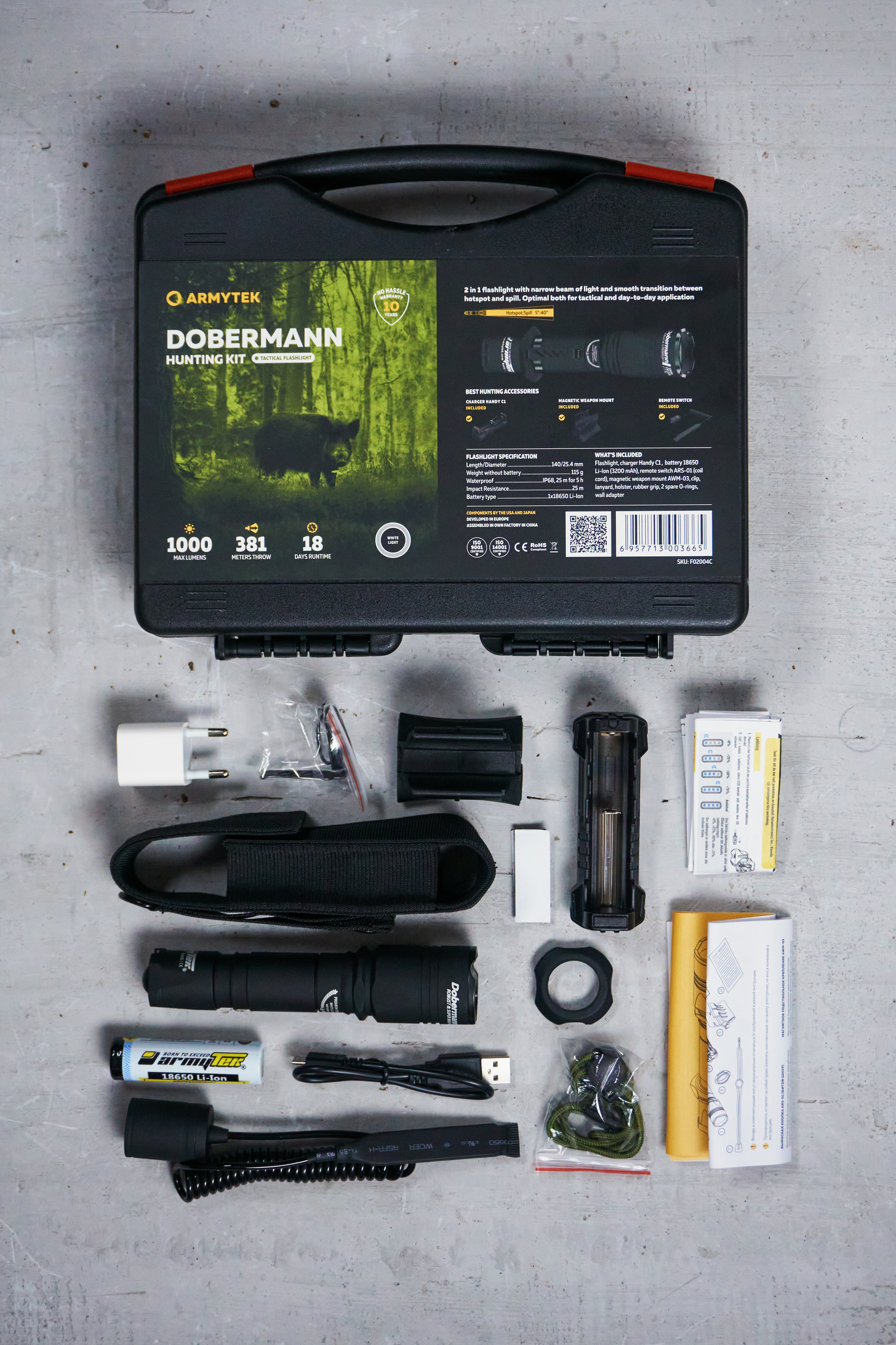 Dobermann Hunting Kit — это готовое решение для максимально эффективного использования на охоте. Набор включает в себя компактный тактический фонарь Dobermann и самые популярные аксессуары к нему.