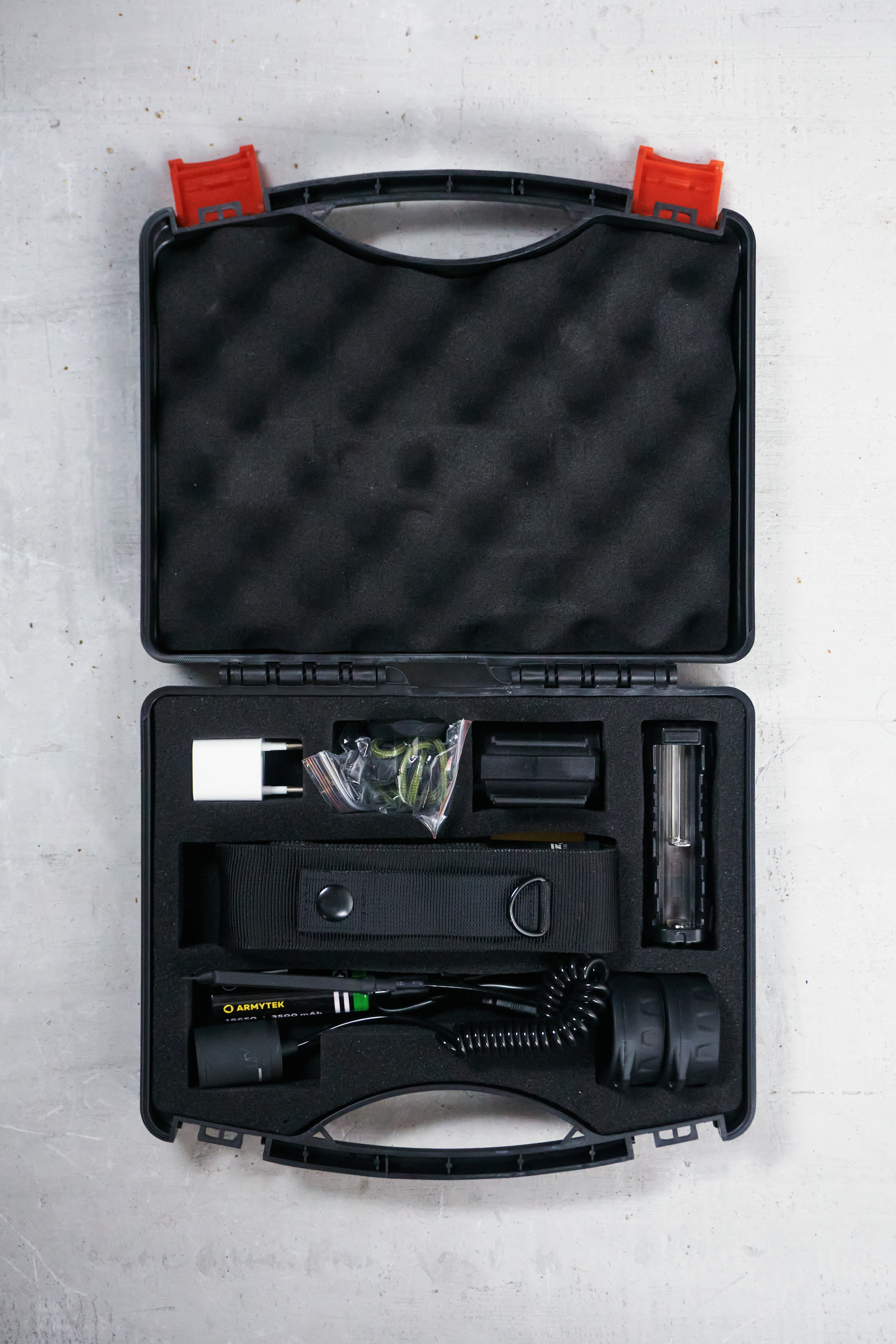 Фонарь, быстросъемное магнитное крепление на оружие, цветные фильтры и выносная кнопка с витым шнуром поставляются в прочном пластиковом кейсе, который удобно возить с собой. В комплект также входят два аккумулятора высокой емкости 3500 мАч, зарядное устройство с функцией Powerbank, нейлоновый чехол, стальная клипса и ремешок на руку.