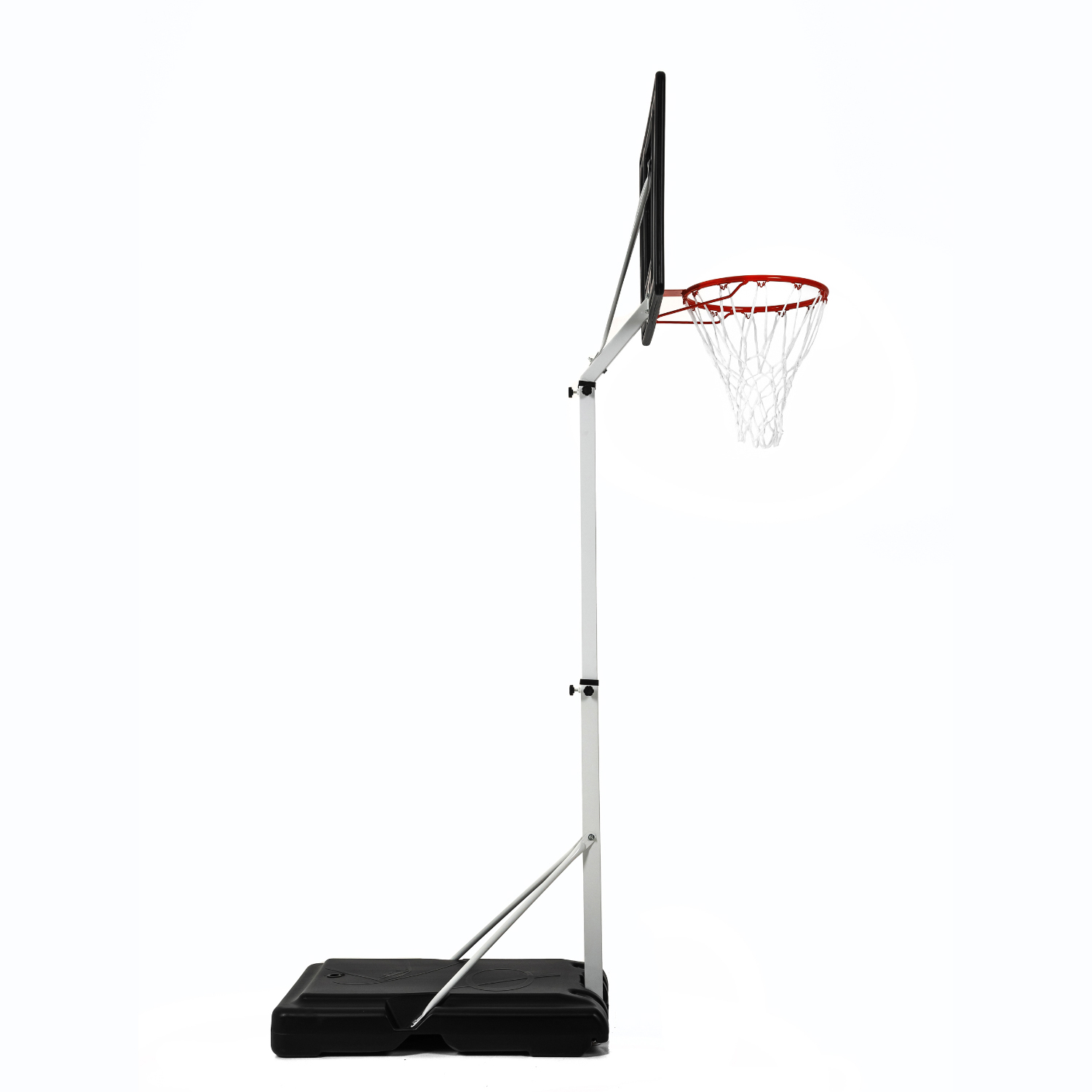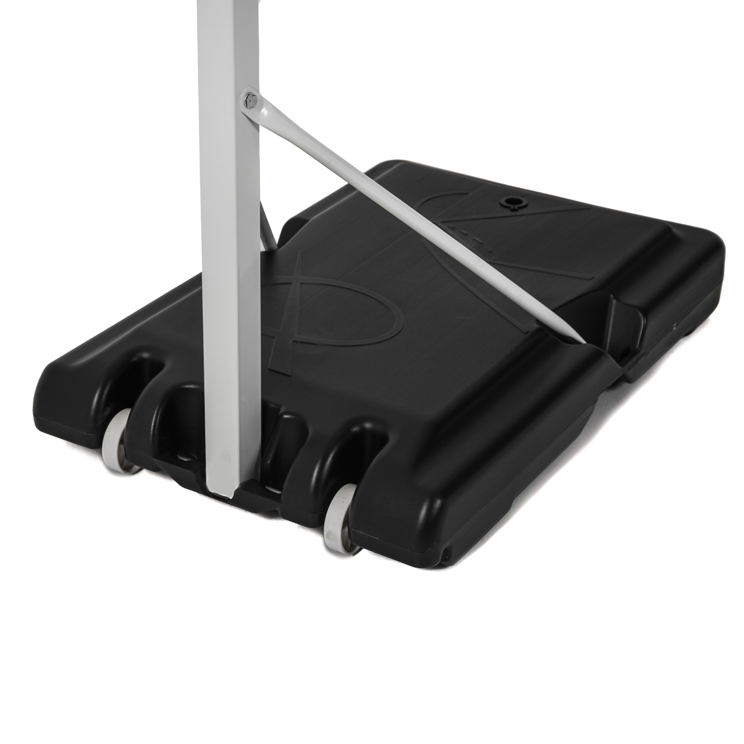 Кольцо диаметром 38 см с сеткой в комплекте. Основание стойки на колёсах, его размер 90 х 60 х 15 см.