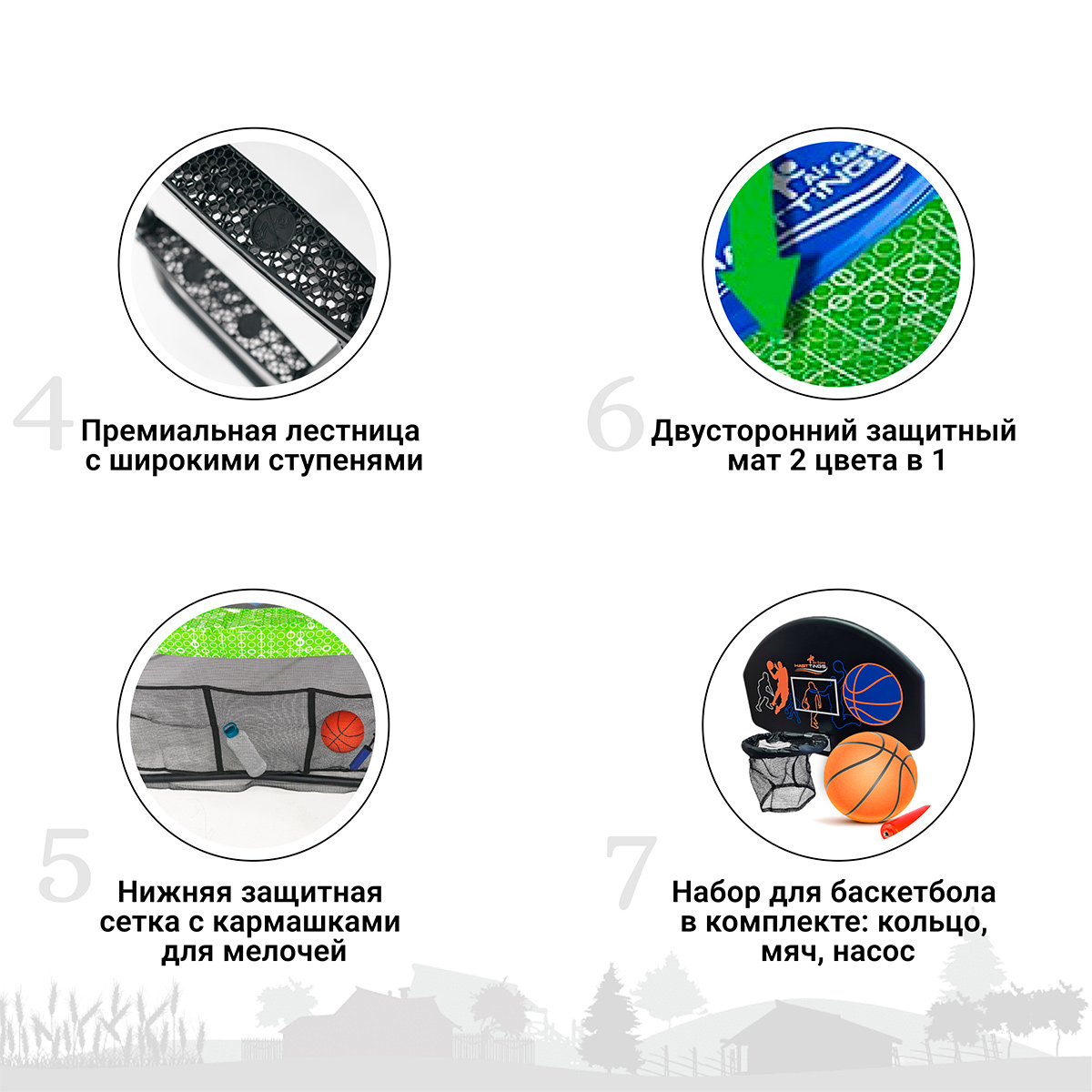 Каркас батута, комплект пружин, защитный мат, верхняя защитная сетка, нижняя защитная сетка, лестница, баскетбольное кольцо, мяч, насос, теневой тент, горка, распылитель водный, ключ для установки пружин, набор инструментов и крепежей