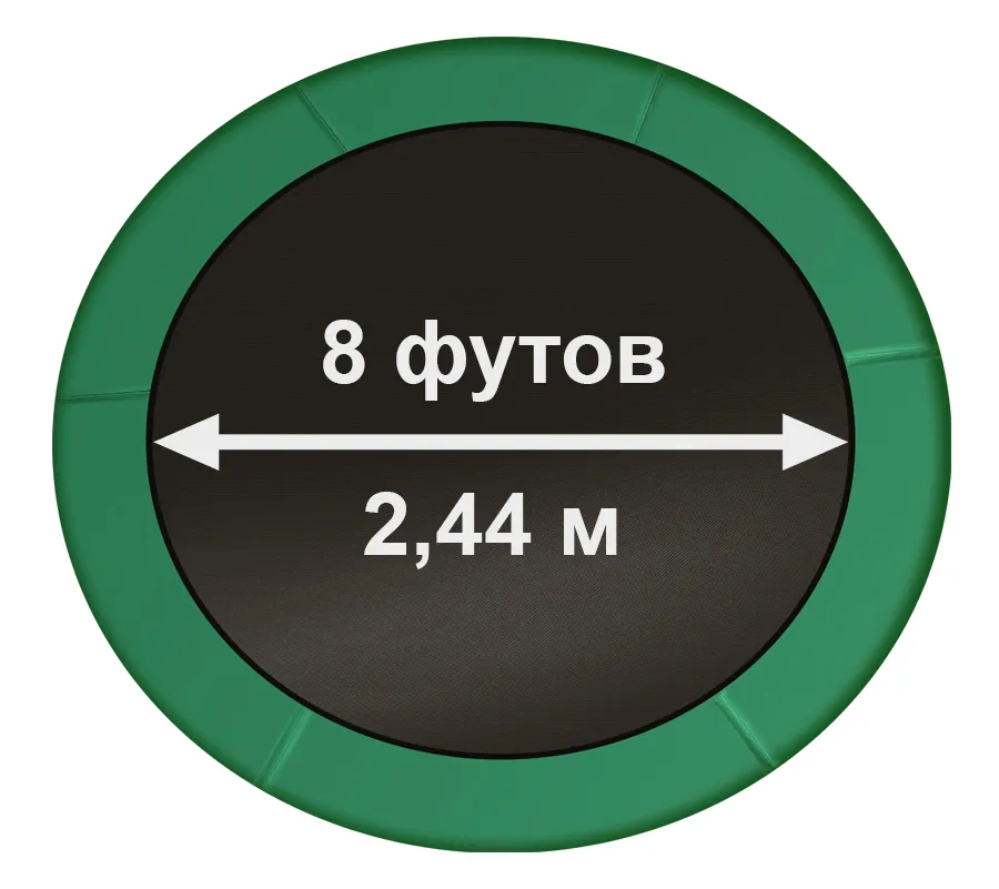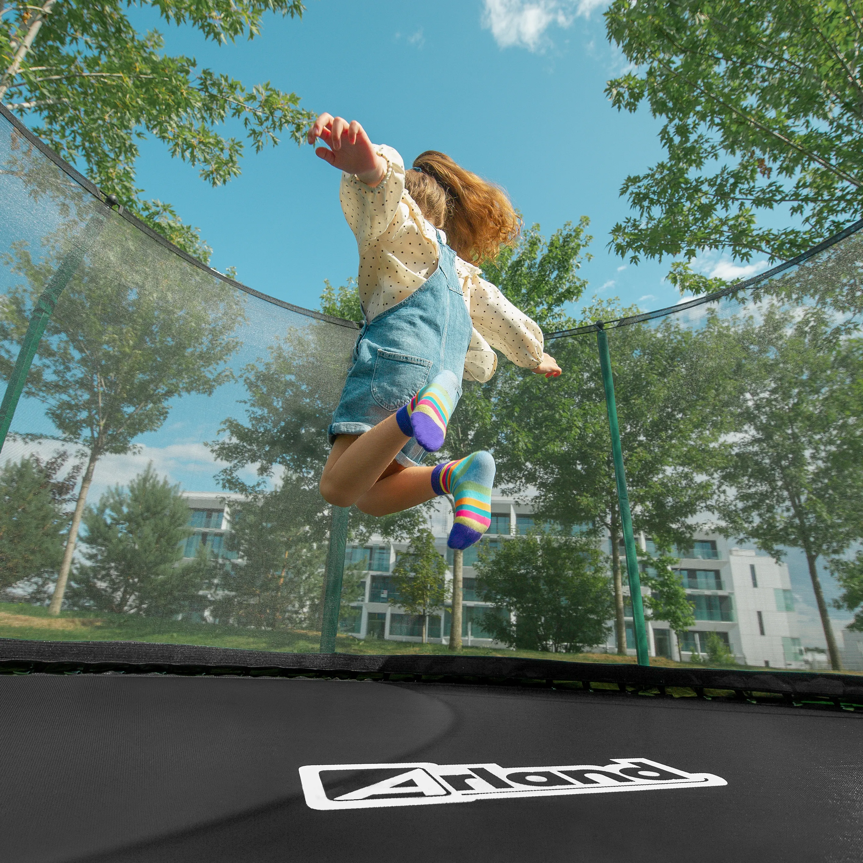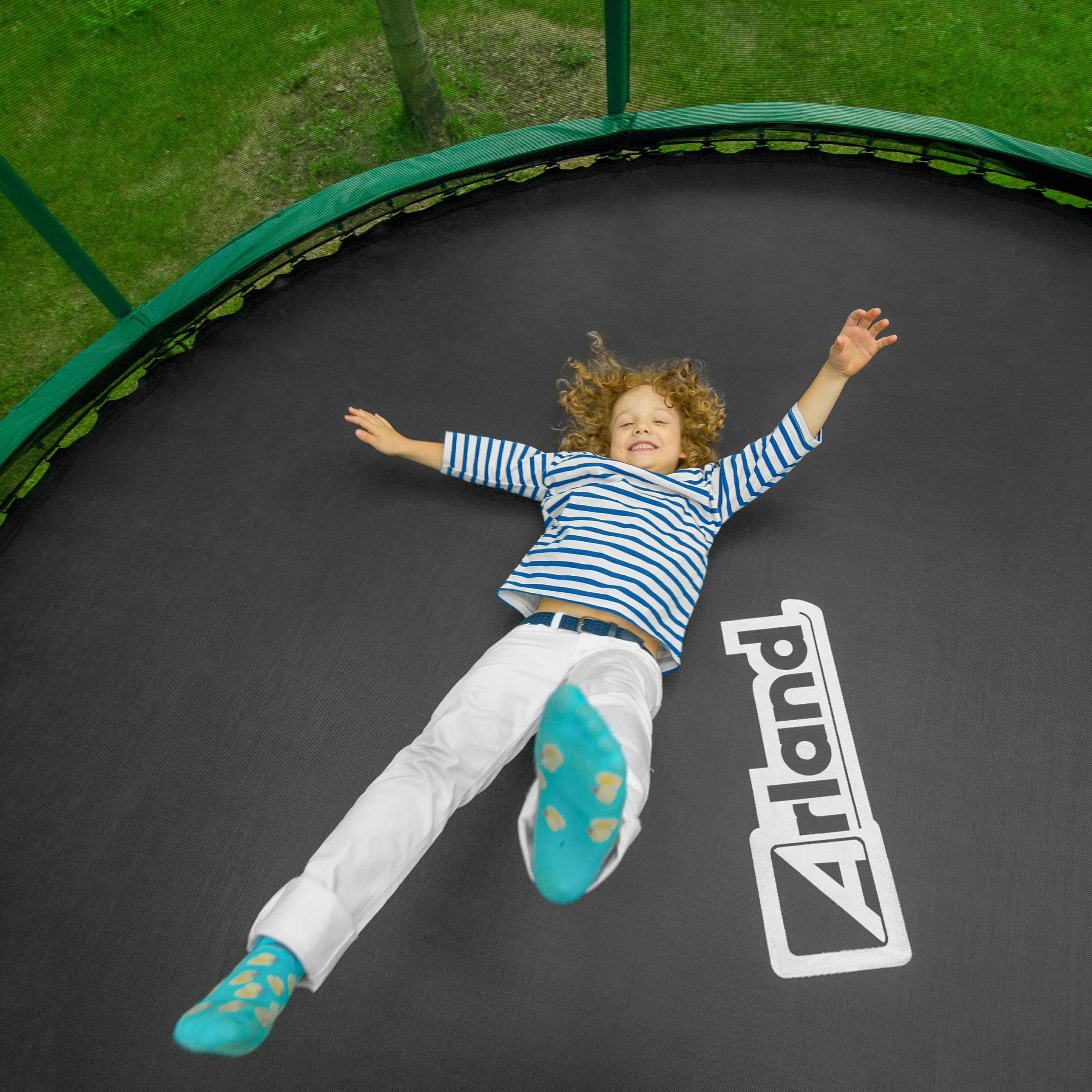 Идеальное средство для отличного настроения всей семьи – это уличные батуты от бренда шведского происхождения ARLAND. Более того, это настоящий помощник в поддержании физической формы, ведь благодаря занятиям на батуте отмечается снижение веса, повышение выносливости, тренируется координация и развиваются все группы мышц. Долговечность и безопасность – две основополагающие характеристики при выборе батута от ARLAND. Построенные на основе высокопрочной стальной рамы, батуты ARLAND рассчитаны на долгие часы прыжков. За соединение всех стальных элементов, обеспечивающих надежность конструкции, отвечает система T-Shaped Component™. Устойчивость на поверхности гарантируют 3 опорные стойки W-образной формы. Оборудование выдерживает вес пользователя до 140 кг. Общий диаметр модели составляет 8 футов (2,44 м). На батуте 8FT с внутренней страховочной сеткой (Dark Green) премиальной серии используется легендарный полипропилен Permatron™, произведенный в США, который является самым прочным материалом для прыжковой поверхности. Верхние изогнутые стойки, в количестве 6 штук, оплетены мягкими прорезиненными чехлами из PVC-материала. На верхней части стойки установлены специальные держатели. Они являются составной частью системы натяжения сетки и крепятся при помощи простого нажатия кнопки Smart Push™. По окружности рабочей зоны на стойки натянута прочная внутренняя защитная сетка высотой 170 см. Максимальное натяжение сетки обеспечивает арматура, проходящая по диаметру стоек. В комплекте с батутом предусмотрена лестница длиной 76 см для удобного подъема. Стоит отметить и стильный темно-зеленый цвет модели, подчеркивающий премиальность и высокий уровень качества продукции. Батуты ARLAND легко собираются своими силами.