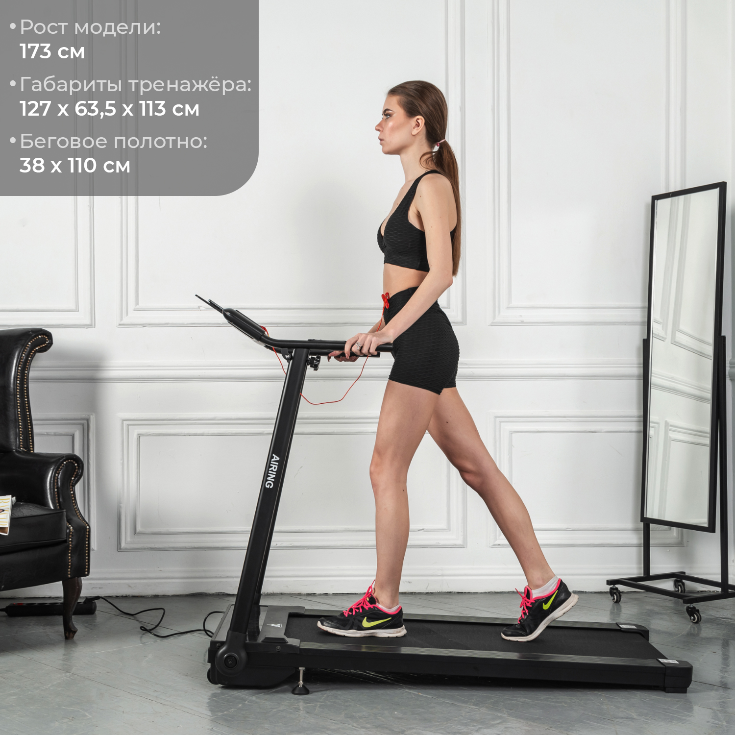 Электрическая беговая дорожка DFC AIRING для полноценных занятий дома. Тренажер начального уровня с мотором мощностью 1,25 л.с. Шаг изменения скорости беговой дорожки 0,1 км/ч.
