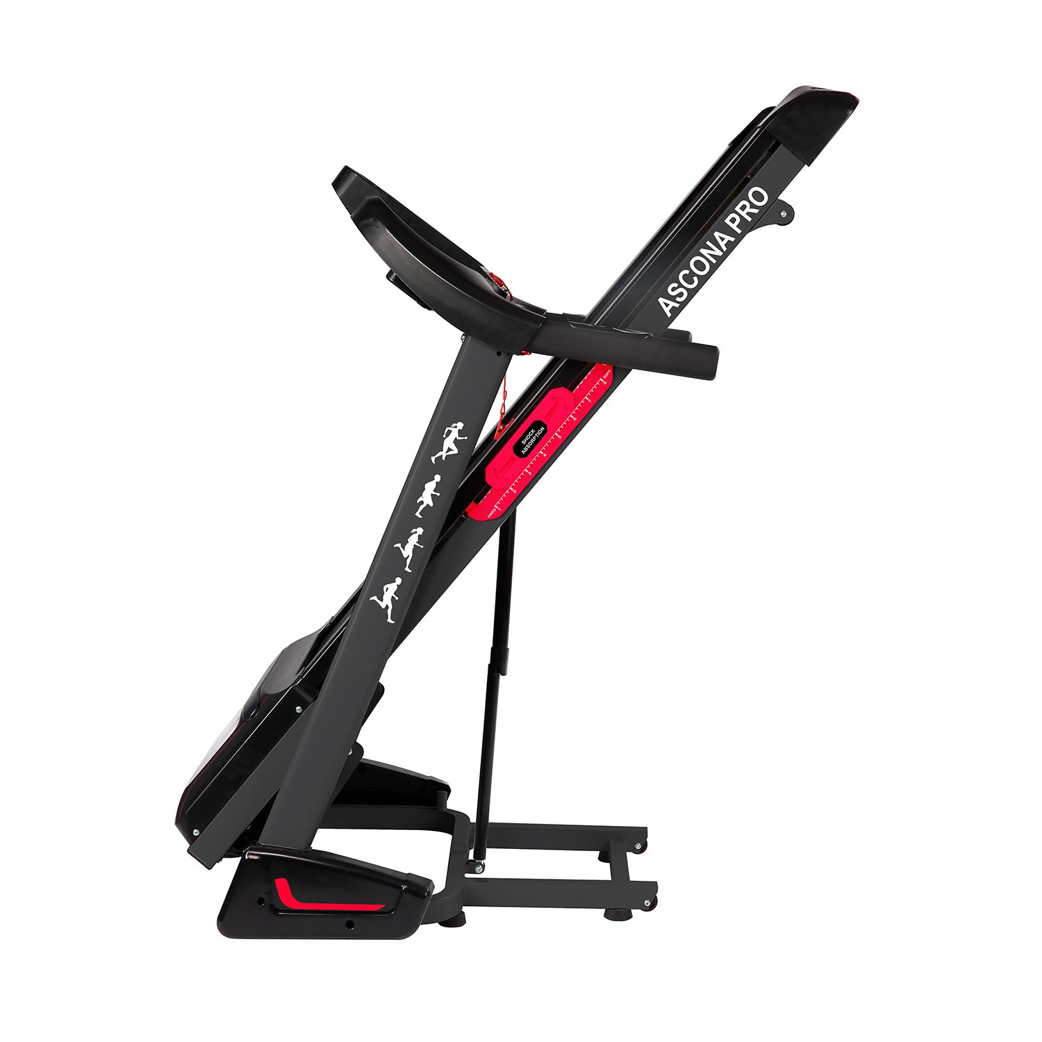 Представляем новую беговую дорожку от популярного бренда DFC - модель ASCONA Pro. Дорожка предназначена для домашнего применения. В арсенале модели встроенный двигатель постоянного тока мощностью 2,5 л.с. При пиковых нагрузках мощность увеличивается до впечатляющих 3,25 л.с. Шаг изменения скорости беговой дорожки 0,1 км/ч. Угол наклона бегового полотна изменяется  c помощью дополнительного встроенного электромотора. Встроенные динамики звуковой системы и возможность подключения дополнительных устройств через MP3-разъем помогут провести тренировку под любимую мелодию. Амортизация с регулировкой жесткости поможет сохранить суставы про время продолжительной тренировки. Два комплекта встроенных в поручни датчиков пульса позволят следить за частотой сердечных сокращений. Такие датчики имеют определенную погрешность. Для точности показаний рекомендуем приобрести нагрудный пояс с монитором в форме часов DFC W117.  Показания консоли : скорость, время, расстояние, калории, пульс. На поручнях так же расположены "быстрые кнопки" - это кнопки запуска и остановки бегового полотна, а так же кнопки изменения скорости. Это позволяет не отрывать руки с поручней во время занятий не тренажере. Дорожка имеет складную конструкцию для экономии жизненного пространства с помощью гидроцилиндра. И  встроенные колеса для перемещения дорожки после тренировки.