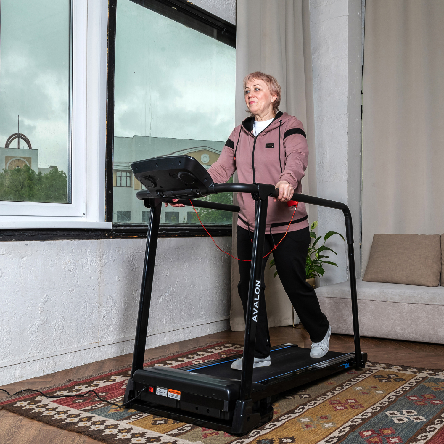 Электрическая беговая дорожка DFC AVALON реабилитационная T185W чёрного цвета для домашнего использования. Двигатель постоянного тока мощностью 1,25 л/с. Скорость регулируется с консоли от 0,8 до 10 км/ч с шагом 0,1 км/ч. Напряжение 220В дорожки, мощность 500 Ватт. Максимальный вес пользователя до 120 кг. Беговое полотно размером 110 х 40 см и толщиной 1,4 мм, под которым располагаются амортизирующие прокладки, создающие более комфортные условия для тренировки. Полотно находится под фиксированным наклоном в 3 градуса. Дорожка с поручнями для реабилитации, на которых располагаются сенсорные датчики пульса. В комплекте ключ безопасности для аварийной остановки. На консоли расположены держатель для планшета и 2 подстаканника, а также ЖК-дисплей с голубой подсветкой. Дисплей отображает такие параметры как скорость, время, расстояние, пульс и калории.
