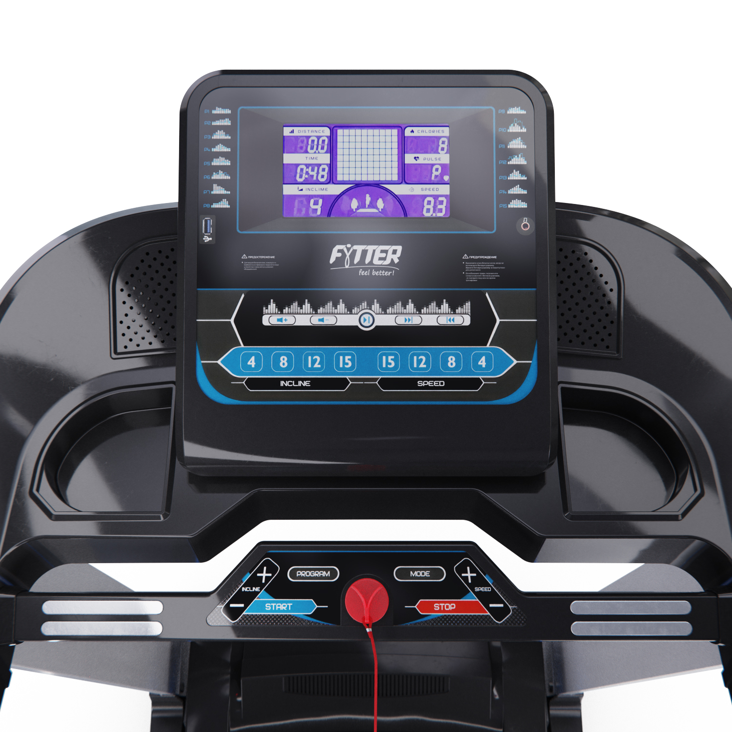Тренажер оснащен 80 встроенными программами, целевым режимом, 5 пользовательскими программами и ручным режимом. 5-дюймовый дисплей показывает всю необходимую информацию о тренировке: время, расстояние, калории, пульс, наклон и программы.