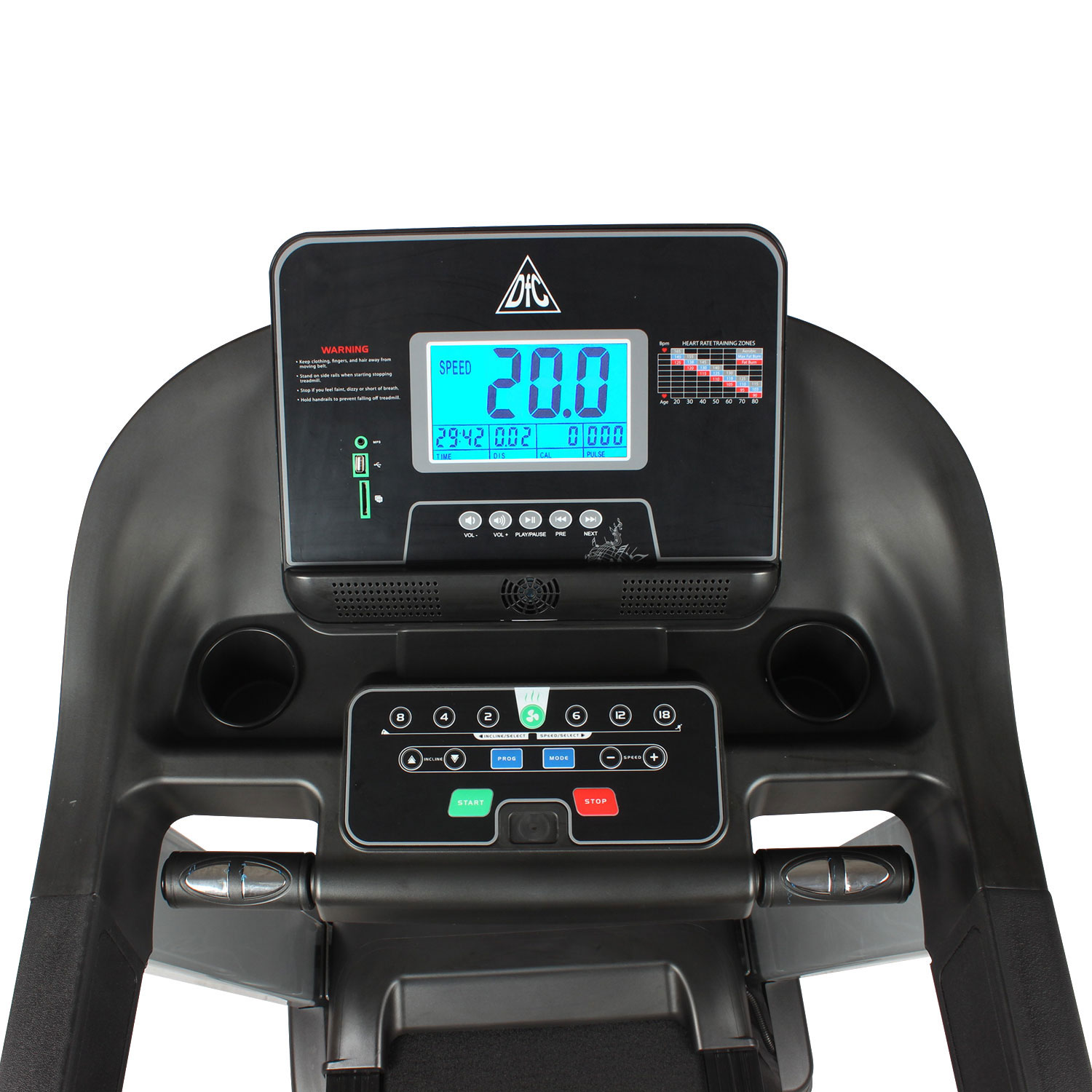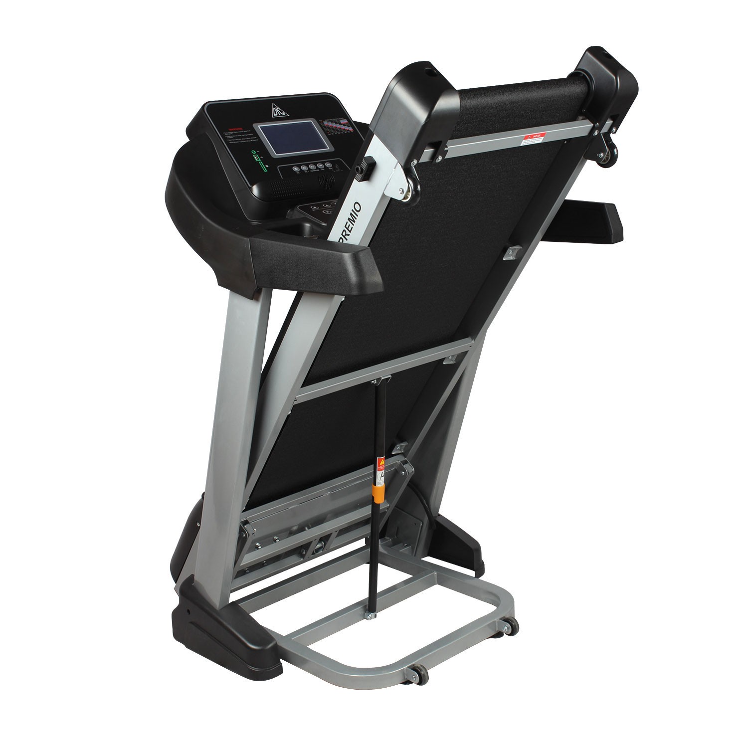 Представляем новую беговую дорожку от популярного бренда DFC - модель PREMIO. Сердцем любой дорожки является ее двигатель. Модель PREMIO оснащена мотором постоянного тока мощностью 3.0 л.с. Угол наклона бегового полотна изменяется с помощью дополнительного электромотора. Шаг изменения скорости 0,1 км/ч. Встроенные динамики звуковой системы и возможность подключения дополнительных устройств через разъемы MP3 и USB помогут провести тренировку под любимую мелодию. Пользователь может нажимать их для увеличения или уменьшения скорости 0,1 км/ч в одно касание. При нажатии кнопки быстрой скорости, например, 6 км/ч, 12 км/ч и 18 км/ч, дорожка переключится сразу на нужное значение скорости. Кнопки управления проигрывателем удобно расположены под экраном на консоли. Провести тренировку с комфортом поможет встроенный в консоль вентилятор. Встроенные в поручни датчики позволят следить за частотой сердечных сокращений. Такие датчики имеют определенную погрешность. Для точности показаний рекомендуем приобрести нагрудный пояс с монитором в форме часов DFC W117. Показания консоли : скорость, время, расстояние, калории, пульс. По обе стороны консоли расположены удобные карманы для бутылки с водой или различных мелочей. Дорожка имеет складную конструкцию для экономии жизненного пространства с помощью гидроцилиндра, и встроенные колеса для перемещения дорожки после тренировки.