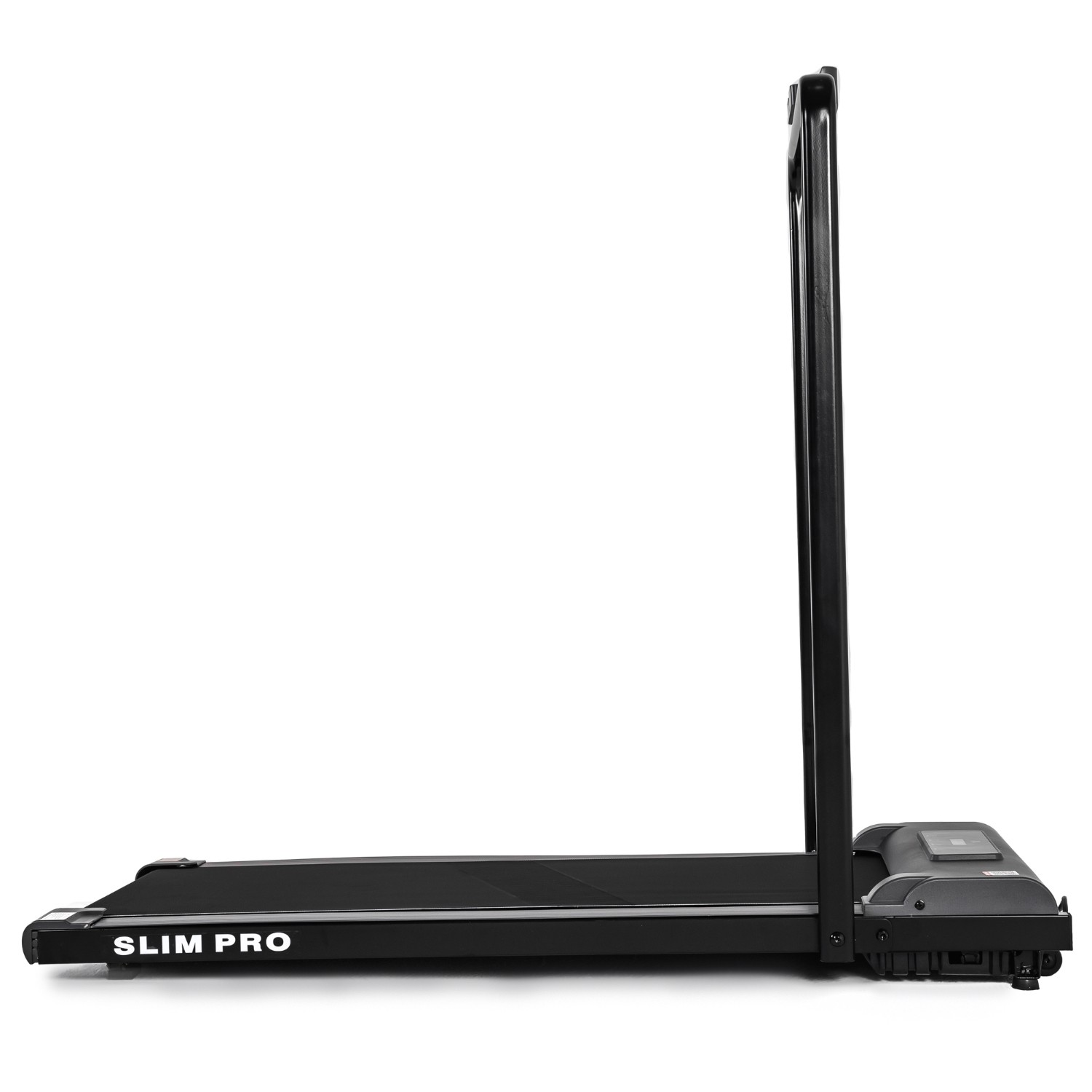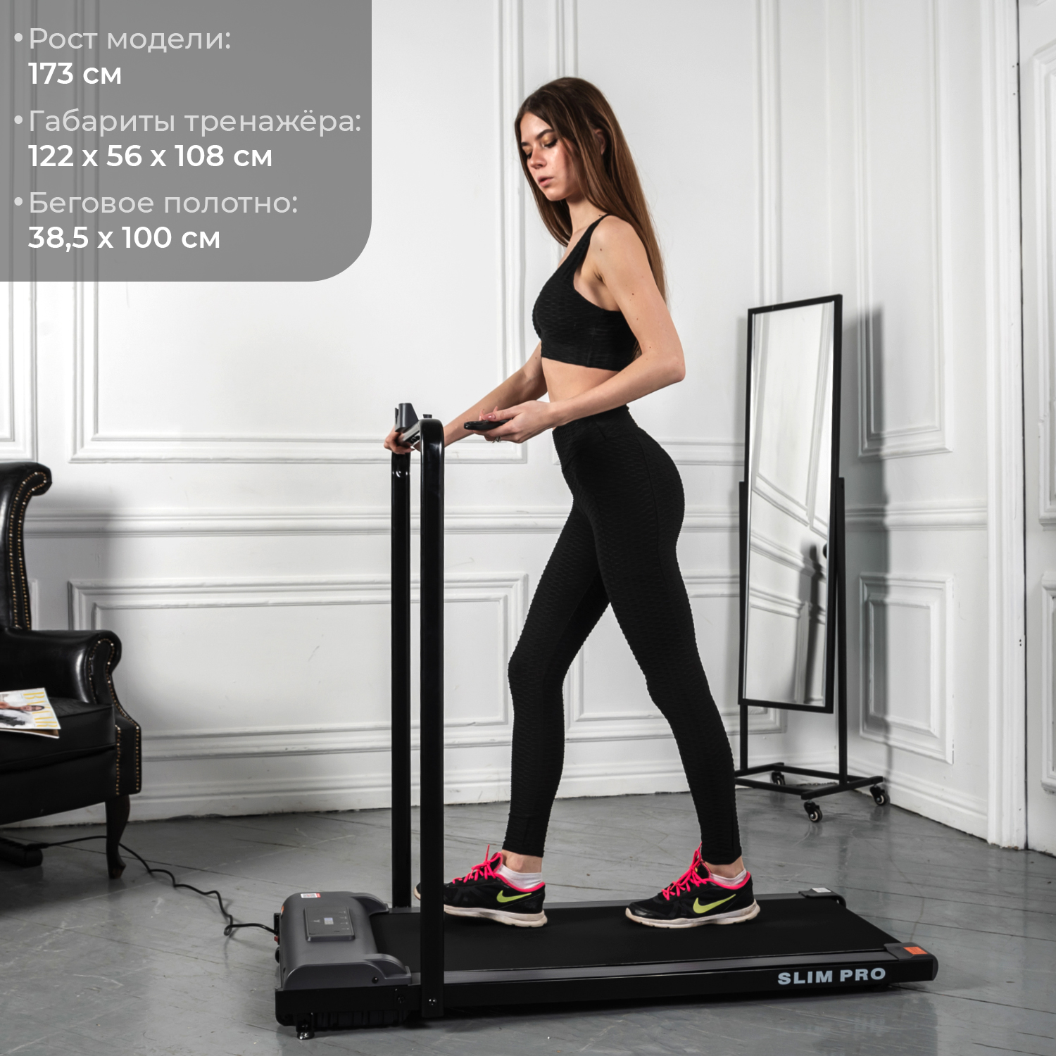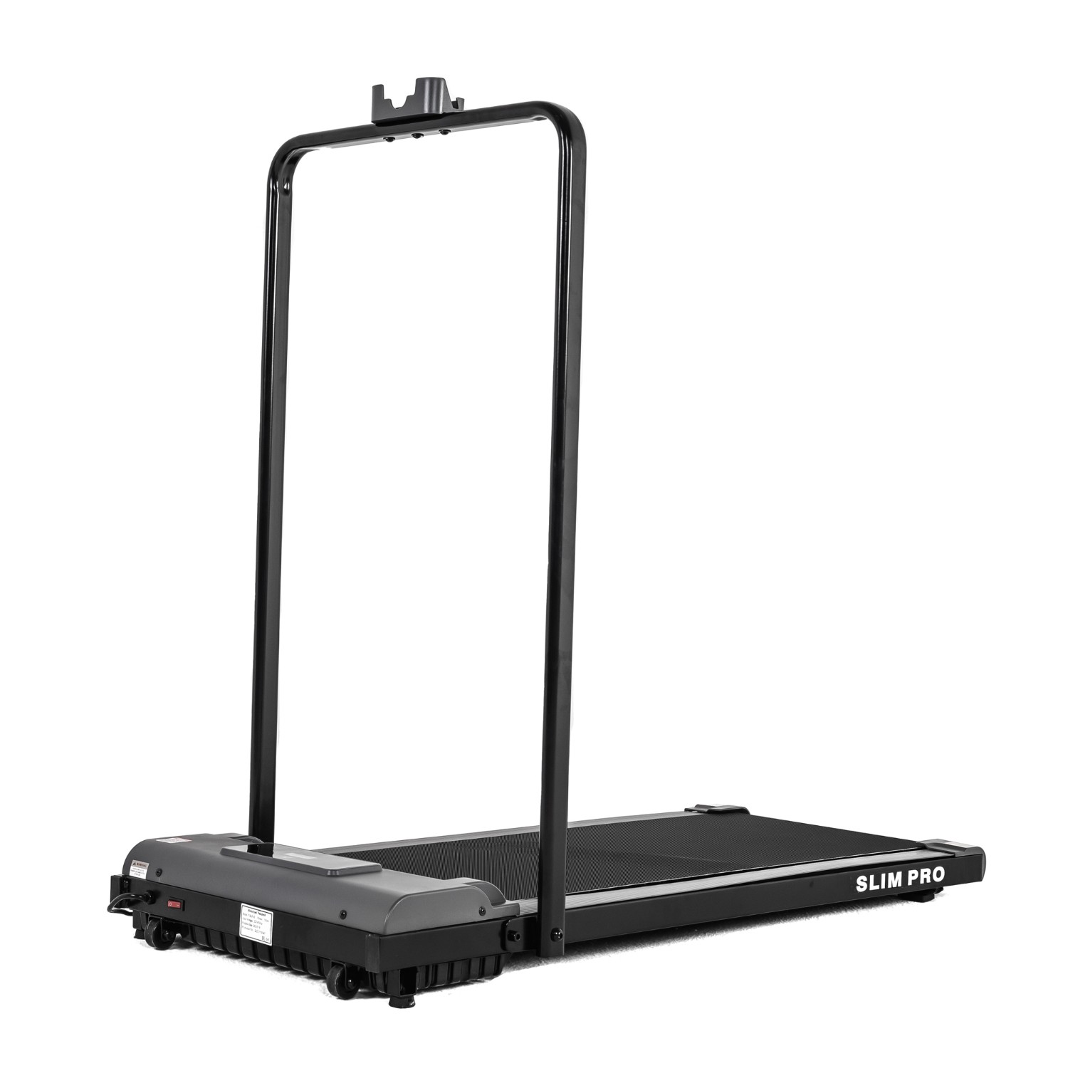 На дорожке установлен удобный складной поручень с держателем под девайс и пульт. После занятий поручень убирается, и тренажер получается очень тонким, всего 12,5 см.