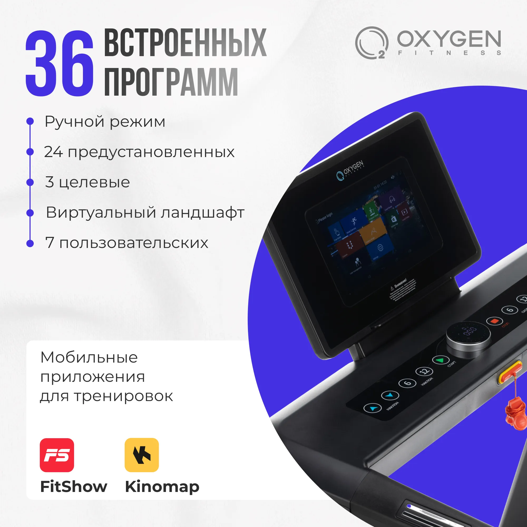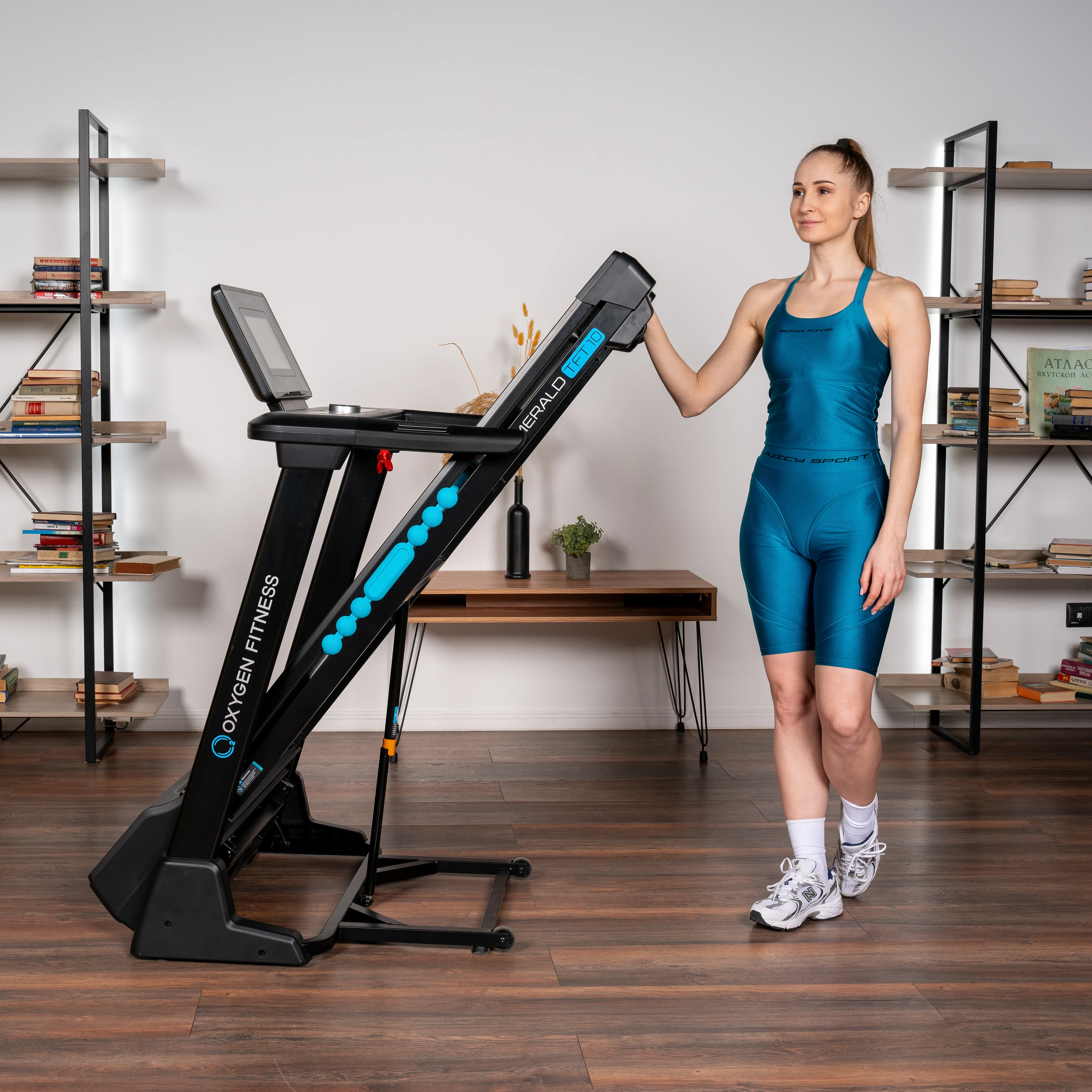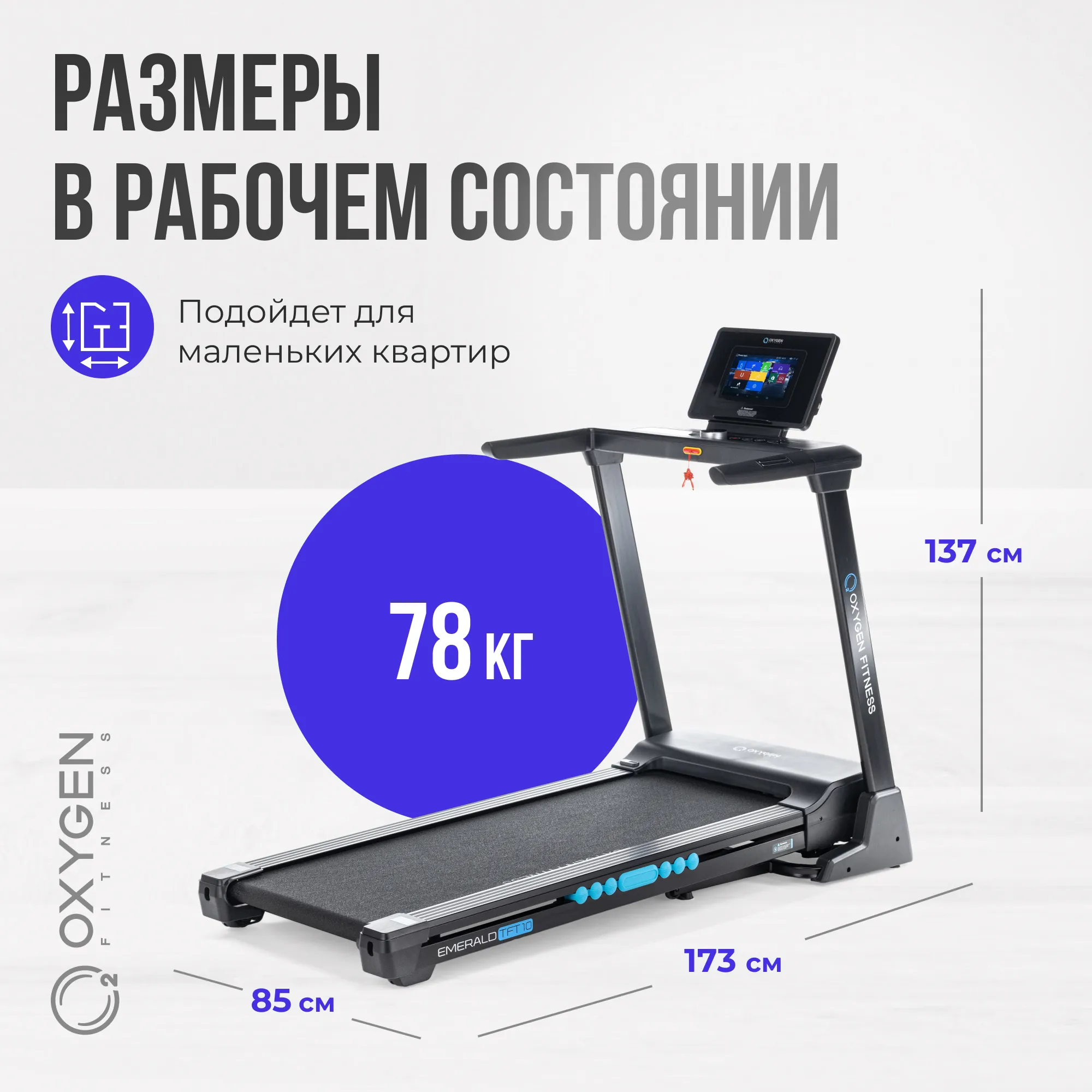 Модель OXYGEN FITNESS EMERALD TFT 10 входит в серию EMERALD от OXYGEN FITNESS - бренда фитнес-оборудования. Эта беговая дорожка является идеальным сочетанием современного дизайна и функциональности для использования дома. Дизайн модели поражает своей стильностью и практичностью. Она выполнена в черном цвете с изысканными голубыми деталями, придающими яркость и современный вид. Гармоничное сочетание цветов делает эту дорожку привлекательной и подходящей для любого интерьера. Она идеально впишется в вашу квартиру, дом, небольшой спортивный зал, дачу или даже офис, обеспечивая комфортные условия для занятий спортом. Модель OXYGEN FITNESS EMERALD TFT 10 предлагает мощный двигатель с мощностью до 3,5 л.с. и пиковой нагрузкой до 6,0 л.с., что обеспечивает стабильный и плавный ход даже во время интенсивных тренировок. Но что делает эту модель особенно привлекательной, так это возможность разгона до 20 км/ч. Это действительно высокий показатель для домашней беговой дорожки, позволяющий пользователям насладиться бегом на полной скорости, подобно тому, как они бегают на открытом воздухе. Такой широкий диапазон скоростей открывает множество тренировочных возможностей, включая интервальные тренировки, улучшение кардио-выносливости и активное сжигание калорий. Модель EMERALD TFT 10 отличается возможностью изменять угол наклона от 1 до 20 уровней. Это открывает широкий спектр тренировочных возможностей, позволяя создавать супер сложные тренировки с имитацией бега или ходьбы в гору. Повышение угла наклона значительно увеличивает интенсивность упражнений, способствует улучшению выносливости и активирует различные группы мышц, делая каждую тренировку более интенсивной и результативной. Антискользящее беговое полотно толщиной 1.6 мм обеспечивает надежное сцепление обуви с поверхностью, что снижает риск травмирования суставов. Размер бегового полотна 140*52 см предоставляет достаточно пространства для комфортных и свободных движений во время тренировок, что особенно важно для длительных тренировочных сессий, позволяя сосредоточиться на достижении целей без дискомфорта. Разработчики модели EMERALD TFT 10 внедрили новую технологию под названием Self Lubricating Running Belt, что означает самосмазывающееся беговое полотно. Это решение облегчает уход за тренажером, сохраняя его производительность длительное время. Технология Self Lubricating создает долговременный смазочный эффект благодаря специальному слою с силиконовым маслом, воском и полимерными материалами. Такой слой позволяет дорожке сохранять гладкость хода и снижает износ, что продлевает срок службы оборудования. Амортизация модели представлена 4 цилиндрическими эластомерами и 2 демпфирующими суперподушками Cushion™. Эта технология снижает нагрузку на суставы во время тренировок, обеспечивая более комфортный и безопасный опыт. Она также уменьшает риск травм и переутомления, делая тренировки на дорожке EMERALD TFT 10 более эффективными и приятными. Беговая дорожка оснащена следующими габаритами в рабочем состоянии: длина - 173 см, ширина - 85 см, высота - 137 см. Благодаря системе складывания easyFOLD™, тренажер освобождает значительное место в помещении - до 112 см в длину. Это позволяет экономить место и делает дорожку удобной для размещения в углу комнаты или в другом ограниченном пространстве. Консоль модели OXYGEN FITNESS EMERALD TFT 10 представлена 10-дюймов