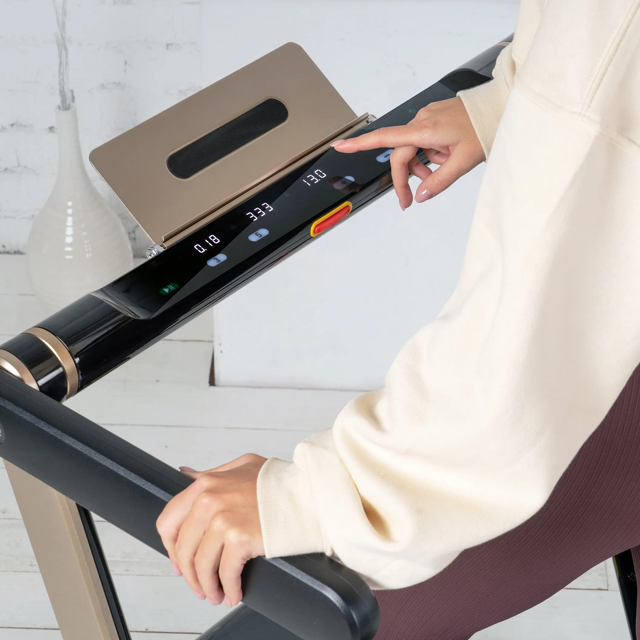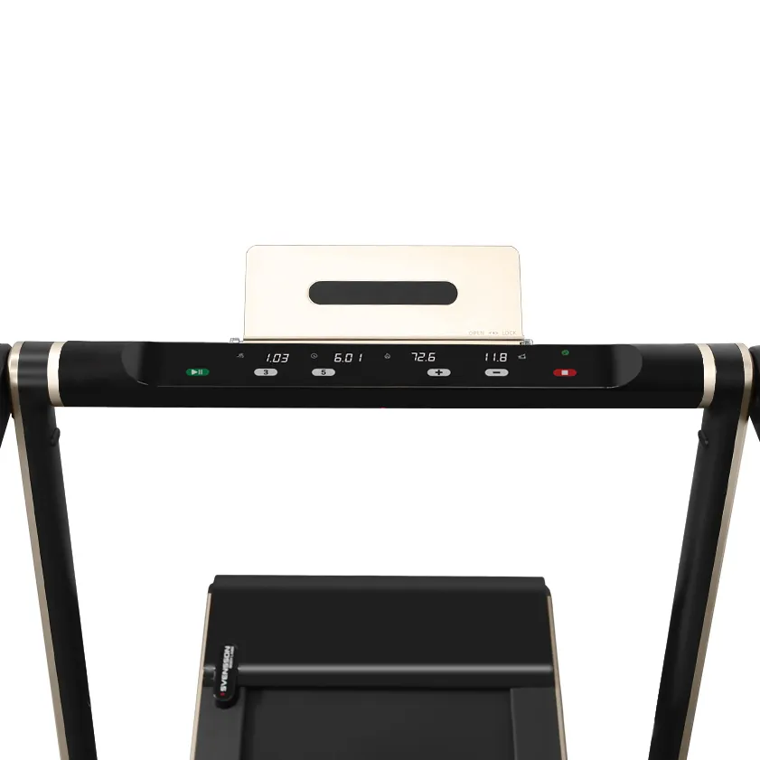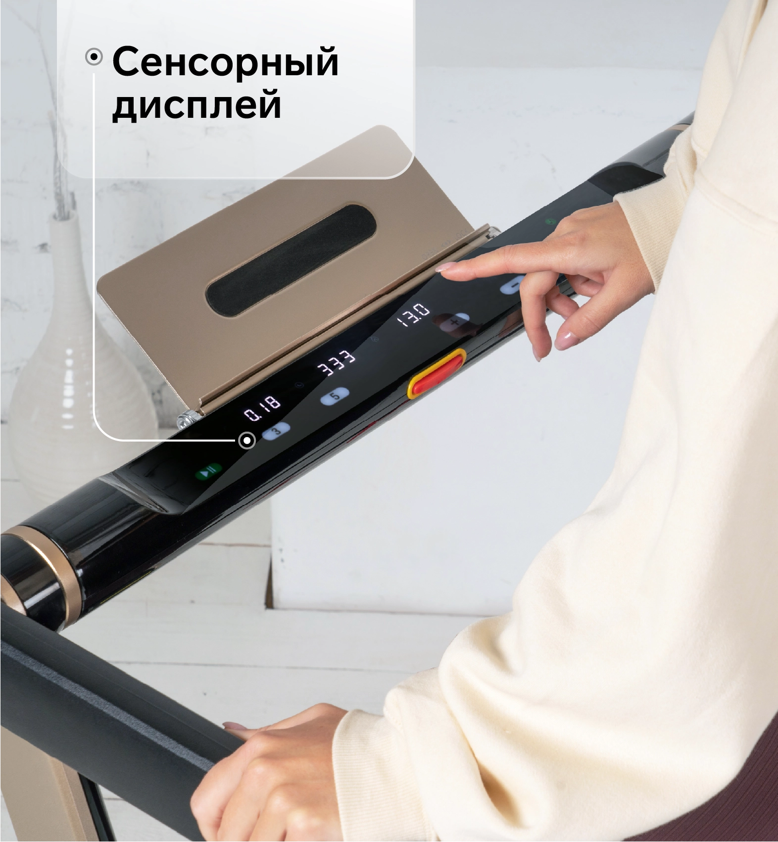 Консоль SPACETECH - это отличное решение не только с точки зрения функционала, но и дизайна. Она представляет собой тонкую панель с черной акриловой поверхностью. 4 LED-дисплея выводят следующие тренировочные данные: дистанция, время, количество шагов, калории и скорость. Сенсорные кнопки изменяют показатели консоли и отличаются своей долговечностью и влагостойкостью. Все элементы консоли прекрасно видны даже в условиях слабой освещенности. Широкая алюминиевая подставка для смартфонов и планшетов фиксируется при помощи встроенной системы складывания. Пользователь может слушать любимую музыку через встроенные динамики, достаточно подключить оборудование к разъему Audio IN minijack 3,5 мм.