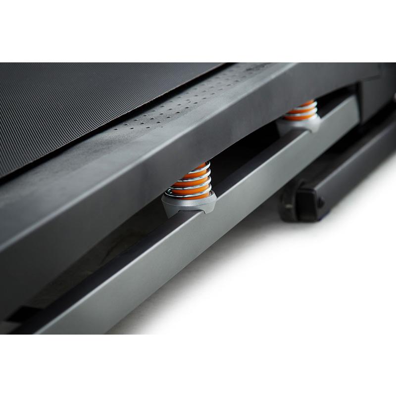 Благодаря запатентованному новаторскому дизайну, тренажёр можно сложить и поставить вертикально. Также беговая дорожка имеет мощный амортизатор, позволяющий с лёгкостью поднять платформу..