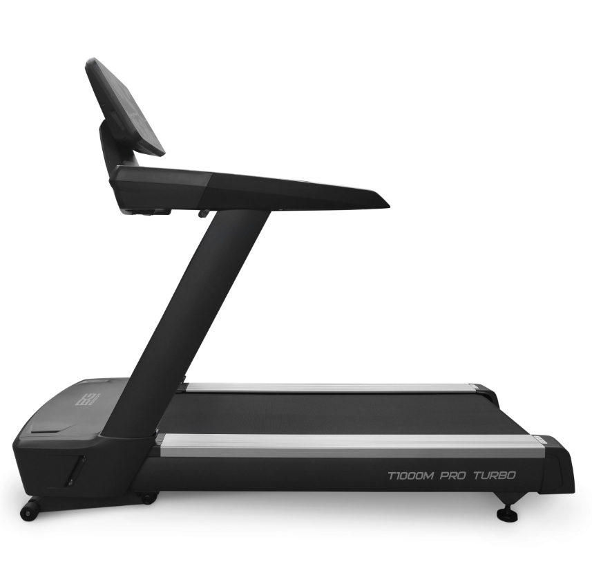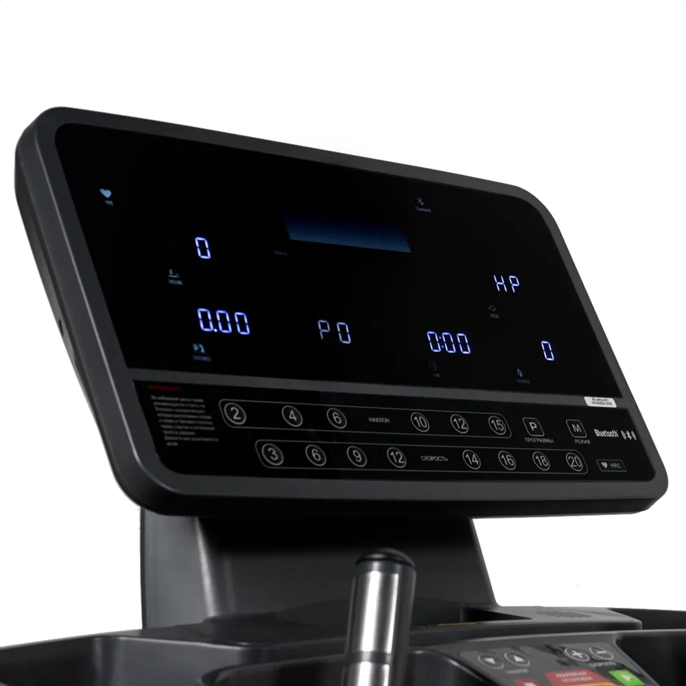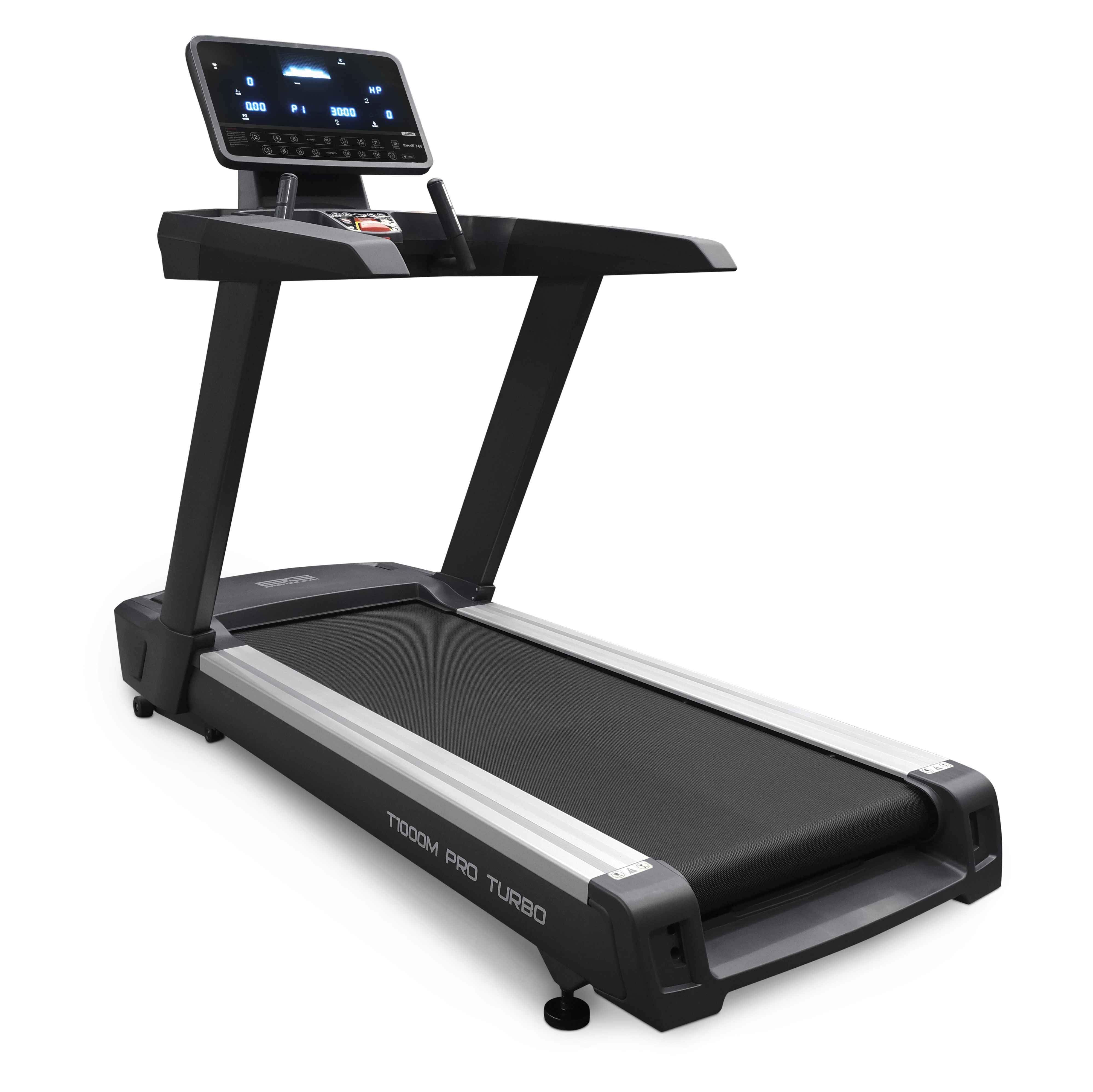 Коллекция 1000-й серии кардио тренажеров от немецкого бренда Bronze Gym отличается классическим строгим дизайном, обладает превосходными биомеханическими опциями и способна выдерживать многочасовые бесперебойные нагрузки. T1000M PRO TURBO NEW – это профессиональная беговая дорожка, разработанная специально для фитнес-клубов с большим потоком клиентов. В основе конструкции – высокопрочная рама с двухслойной покраской. Вес изделия составляет 198 кг и способен выдерживать пользователей до 180 кг. Беговая дорожка идеально подойдет для любителей высокоэффективных тренировок и профессиональных спортсменов. Чтобы удовлетворить самые высокие потребности, под капотом T1000M расположен двигатель с мощностью 6 л.с. (в режиме пиковых нагрузок 8,5 л.с.). Оборудование способно развивать скорость до 25 км/ч, а угол наклона изменяется электрическим способом в 15 положениях. Для улучшения качества тренировочного процесса и его разнообразия на T1000M PRO TURBO NEW установлено ортопедическое полотно профессионального класса (толщина 2,5 мм) с огромной беговой зоной размером 162*60 см. Для сокращения нагрузки на суставы дорожка оснащена амортизационной системой на базе 4 эластомеров и подушек, расположенных по периметру полотна. Тренировочный компьютер T1000M PRO TURBO NEW представлен многофункциональным LED дисплеем с точечной матрицей профессионального уровня. Основной экран дополняют 6 небольших буквенно-цифровых информационных окон с белой подсветкой. Все клавиши русифицированы. На экран компьютера выводятся все основные данные – программный профиль, время, скорость, дистанция, калории, пульс, угол наклона. В программный пакет входят 36 предустановленных программ, в которых используются различные виды тренировок. Помимо предустановленных программ, можно воспользоваться самостоятельно регулируемым ручным режимом, а также создать собственную программу в одном из 3-х пользовательских режимов. 3 пульсозависимые программы отвечают за тренировку тех пользователей, которым важно контролировать верхние пределы частоты сердечного ритма. Еще одна функция - жироанализатор Body Fat - даст оценку параметрам, связанным с весом.