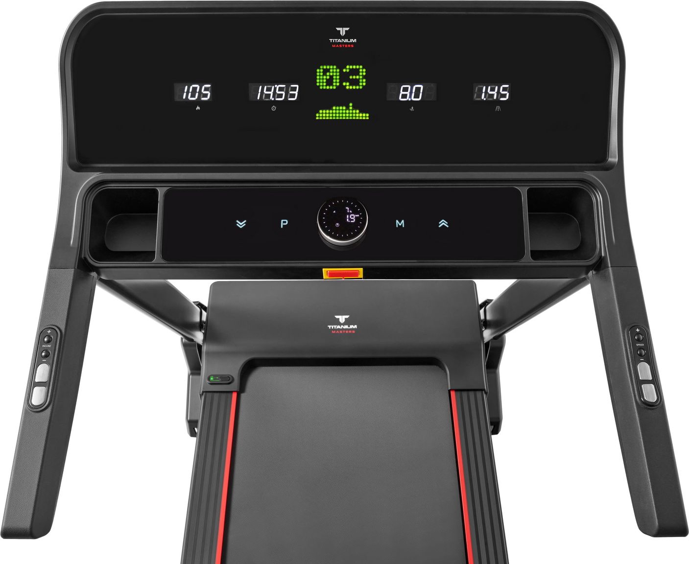 Titanium Masters Physiotech A480 – премиальная беговая дорожка c великолепными техническими характеристиками и демократичной для такого класса ценой. Тренажер по своим параметрам приближается к уровню оборудования в фитнес клубах и подходит для пользователей любого уровня подготовки, от начального до профессионального. Что обычно требуется от беговой дорожки? Надежный и мощный двигатель с плавным ходом, большое беговое полотно, хорошая мягкая амортизация, информативная консоль с понятным управлением и, желательно, электрический угол наклона для максимальной эффективности тренировочного процесса. В Titanium Masters Physiotech A480 установлен один из самых надежных в индустрии двигателей от японской Fuji Electric. Учитывая мощность в 3,75 л.с., максимальный вес пользователя практически не ограничен и составляет 160 кг. Движение полотна максимально плавное, у него нет эффекта проскальзывания. Само полотно большое, комфортное и безопасное – его размер составляет 141 см в длину и 52 см в ширину. Благодаря мощному мотору, Physiotech A480 показывает высокие скоростные параметры – максимальная скорость составляет 20 км/ч. Конечно же, дорожка такого уровня не может быть без электрического угла наклона, его диапазон оставляет от 0 до 20%. На верхних значениях угол достаточно крутой и обеспечит достаточную нагрузку тем пользователям, кому нужно получить от тренажера максимум. Амортизационная платформа, скомбинированная из связки 2-х полиуретановых амортизаторов rubber-HEADS™и 8-ми динамических эластомеров VCS™ коммерческого класса, настроена на средне-мягкий уровень жесткости и является одной из лучших на сегодняшний день систем амортизации с минимальной нагрузкой на суставы. Отдельно стоит сказать про консоль и механику управления. Дисплей состоит из основного LED экрана c профилем тренировки и нескольких дополнительных, выводящих основные параметры тренировки. Часть управления вынесена на джойстик-шайбу – это удобный и современный метод управления. Одновременно сам джойстик-шайба представляет из себя LCD экран, на который выводятся такие параметры как скорость, угол наклона и частота пульса. Для дополнительного удобства управление скоростью и наклоном также вынесено на боковые поручни – там же расположены и сенсорные датчики пульса. В программный пакет тренировочного компьютера входят 15 различных тренировочных профилей, 3 целевых режима с обратным отсчетом (дистанция, время и калории), а также 3 пользовательских режима, где программу тренировки можно создать под себя. Есть здесь также и жироанализатор Body Fat. Titanium Masters Physiotech A480 легко складывается с помощью двухфазной гидравлики easy-DROP™ и перемещается посредством 2-ух транспортировочных роликов. Преимуществом дорожки является система автоматического смазывания. Достаточно раз в несколько месяцев доливать силиконовую смазку в специальную емкость – и далее система будет самостоятельно распределять необходимое количество смазки. Преимущества: • Высококачественные компоненты премиального класса • Мощный двигатель Fuji 3,75 л.с. • Многоэкранный LED-дисплей с профилем тренировки • Управление с помощью современной шайбы-джойстика с LCD дисплеем • Максимальная скорость 20 км/ч • Электрический угол наклона с диапазоном 0-20% • Великолепная средне-мягкая амортизация из 2 полиуретановых амортизатора rubber-HEADS™и 8 эластомеров VCS™ • 