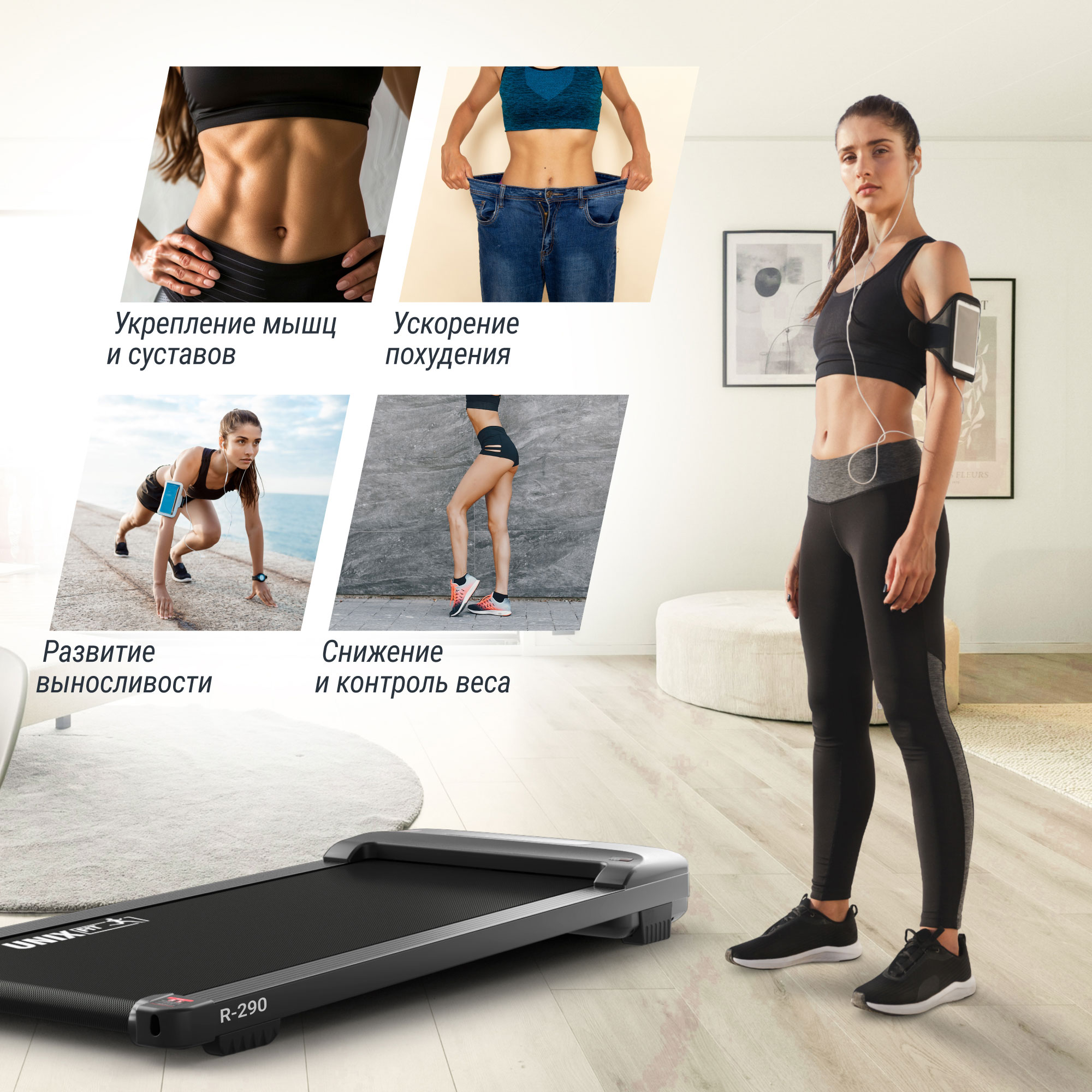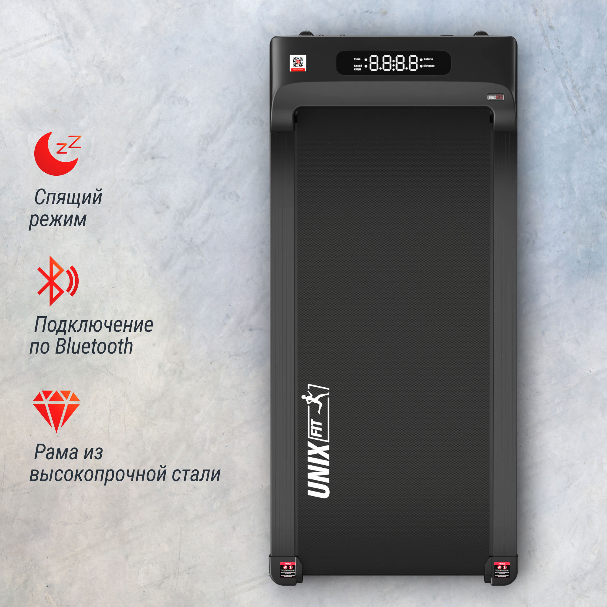 Беговая дорожка UNIX Fit R-290 отличное решение для тех, кто хочет оставаться активным и поддерживать отличную физическую форму, не покидая комфорт дома. Эта дорожка создана для людей, которые ценят пространство и время, но не хотят жертвовать качеством своих тренировок. Электрическая беговая дорожка разработана с учетом использования в ограниченном пространстве. Её минималистичный дизайн позволяет легко разместить мини дорожку в любой комнате — будь то гостиная или спальня. После тренировки вы можете убрать ее в шкаф или под кровать. Уникальная конструкция без поручней обеспечивает полную свободу движений. Вы можете бегать, ходить или выполнять интервальные тренировки, не ограничивая себя в движениях. Благодаря мощному двигателю с пиковой мощностью 2,5 л.с., тренажер гарантирует надежность и высокую производительность дорожки даже во время интенсивных тренировок и разгоняет ее до 9,5 км/ч. LED дисплей в корпусе дорожки отображает ключевую информацию о вашей тренировке: скорость, время, пройденное расстояние и количество сожженных калорий. Вы сможете легко отслеживать свой прогресс и настраивать тренировки под свои цели. А с помощью пульта дистанционного управления вы можете не прерывая тренировки увеличить или уменьшить скорость. Несмотря на компактные размеры, домашний кардио тренажер оснащен ключом безопасности, который поможет остановить дорожку в экстренном случае. Антискользящее беговое полотно 110 х 45 см и система амортизации обеспечивают максимальную безопасность во время тренировок. Мягкое покрытие снижает нагрузку на суставы, что особенно важно для людей с проблемами опорно-двигательного аппарата. Благодаря современным технологиям и высококачественным материалам, компактная дорожка работает практически бесшумно. Вы можете заниматься в любое время суток, не беспокоя соседей или членов семьи. Регулярные тренировки на беговой дорожке помогают укрепить сердечно-сосудистую систему, улучшить обмен веществ и поддерживать здоровый вес. Кроме того, физическая активность способствует снятию стресса и улучшению настроения! Также, имеется возможность синхронизации беговой дорожки с мобильным устройством при помощи приложений FitShow (подключение через Bluetooth) с возможностью управления беговой дорожкой и сохранения тренировок. Тренируйтесь с удовольствием вместе с UNIX Fit!