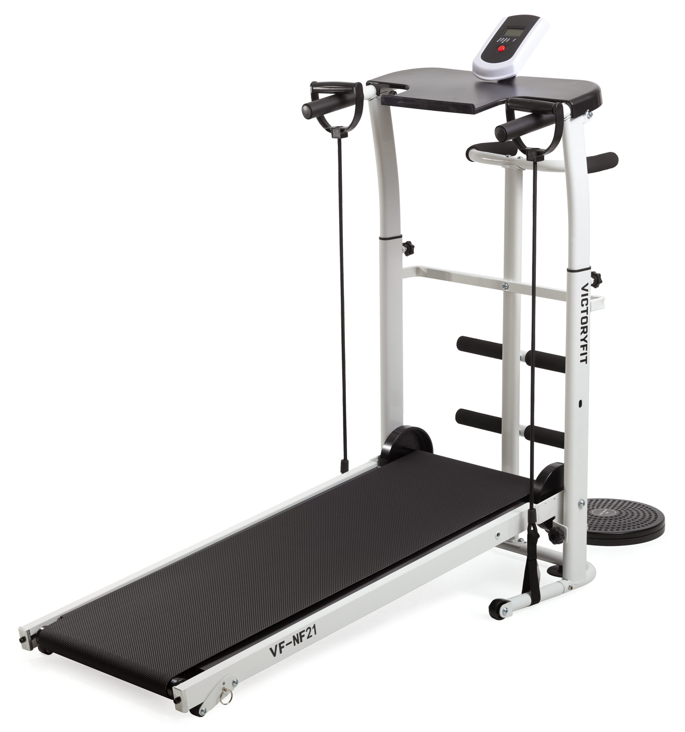 Беговая дорожка VictoryFit VF-NF21. Компактная модель механической дорожки без двигателя. Регулируемая высота поручней от 92-110 см от пола. В комплекте идут 2 эспандера (длина 90 см) и диск здоровья (диаметр 25 см). Сзади дорожки расположены поручни для занятий на диске. Спереди расположены валики для фиксации ног для упражнений на пресс. Компьютер отображает пройденную дистанцию, время, скорость, калории.