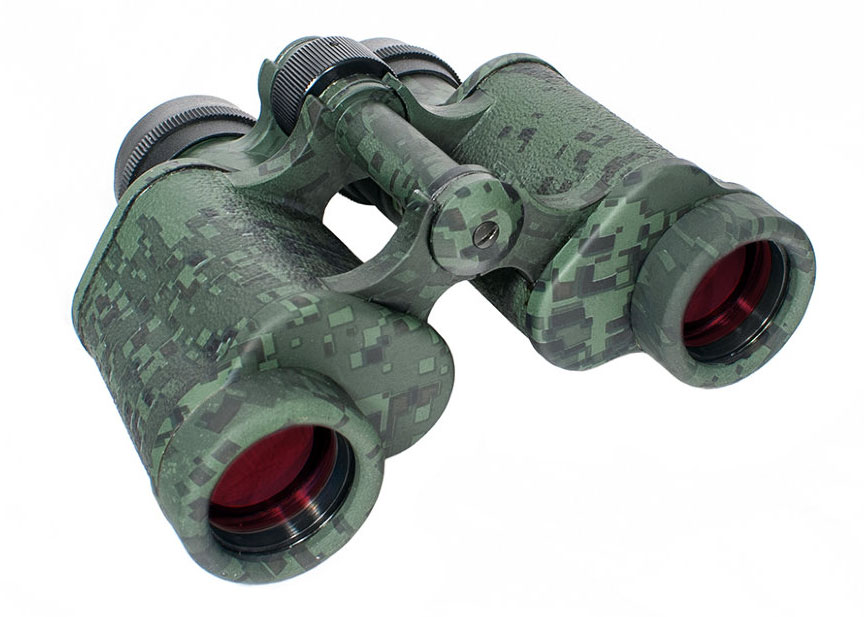 Компактный бинокль в камуфляжном корпусе. Тип призмы: Porro. Диаметр объективов – 30 мм, а увеличение – 8 крат. Рубиновое покрытие оптики повышает светочувствительность бинокля в сумерках, а также блокирует вредное ИК-излучение. Правый окуляр снабжен угломерной сеткой. Корпус изготовлен из алюминия и снабжен покрытием из искусственной кожи.