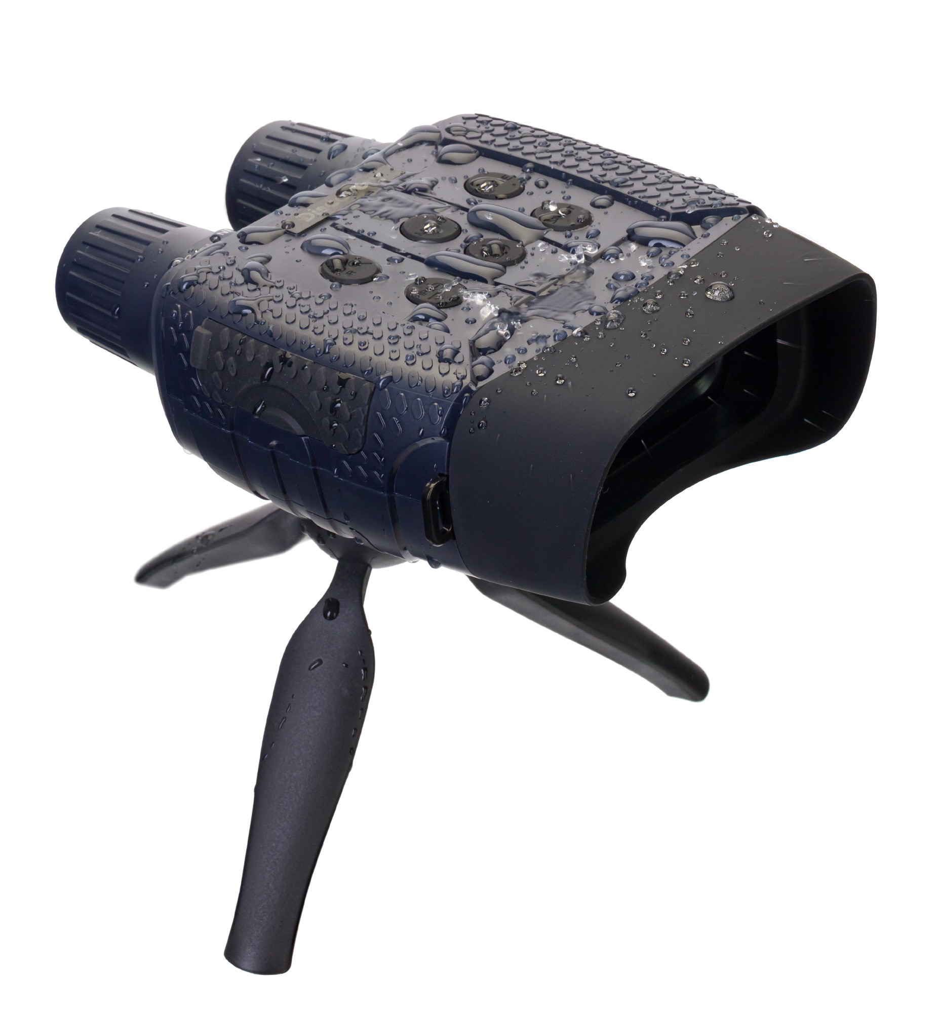 Бинокль удобно лежит в руках, все кнопки управления сразу оказываются под пальцами. Благодаря влагозащите он способен стойко переносить многие полевые испытания. Питание обеспечивается стандартными батарейками или никель-металлогидридными аккумуляторами. На одном заряде ПНВ способен работать от 4 до 10 часов (реальная длительность работы зависит от интенсивности использования ИК-подсветки). Также прибор дополнен небольшим штативом складной конструкции. С его помощью бинокль можно устойчиво разместить где угодно и тем самым повысить стабильность изображения. Это особенно полезно при длительных наблюдениях и видеозаписи.
