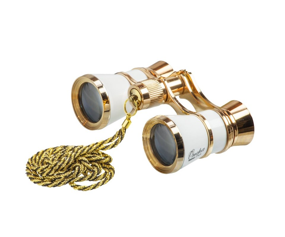 Классическая галилеевская оптическая схема с центральной внутренней фокусировкой, заключенная в белый лакированный корпус с позолоченными (18к) элементами. Трехкратное увеличение и широкое поле зрения позволят вам насладиться представлением даже с галерки.