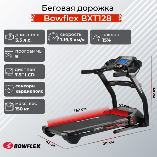 Беговая дорожка Bowlfex BXT128 – это одна из самых технологичных моделей для максимально эффективных и комфортных тренировок.Надежный двигатель мощностью 3.5 л.с. раскручивает полотно до 19.3 км/ч, а максимальный угол наклона в 15% позволяет разнообразить тренировки и имитировать условия интенсивного подъема для любителей бега по пересеченной местности.Беговая дорожка Bowlfex BXT128 оснащена высокопрочным 3-х слойным полотном размером 51x152 см и инновационной системой амортизации Comfort Tech 3 Теперь каждый шаг идеально сглаживается, создавая ощущения пробежки на профессиональном покрытии! На поручнях с мягким полиуретановым покрытием размещены кнопки регулировки наклона и скорости. Менять тренировочные режимы стало еще проще и удобнее!Вся информация о тренировке выводится на 7,5-дюймовую LCD консоль. На панели отображается не только общее количество сжигаемых калорий, но и сожженные калории за последнюю минуту. Это одно из главных преимуществ модели BXT128 и отличная мотивация для еще более эффективной работы на кардио тренировках!Также на консоли отображается: частота сердечного ритма; скорость бега; уровень наклона дорожки; режим тренировки; время; пройденное расстояние. Для мотивации к новым достижениям беговая дорожка оснащена 9 интеллектуальными режимами тренировки, а также встроенным Bluetooth для синхронизации со специализированными фитнес-приложениями. Бегай, совершенствуйся и анализируй результаты с подробной статистикой на смартфоне!Быстро сложить и убрать беговую дорожку позволит уникальная технология SoftDrop и встроенные транспортировочные колеса. В таком состоянии тренажер занимает минимум места и не доставляет дискомфорта при хранении.Помимо основных электронных систем, модель Bowlfex BXT128 дополнена качественным MP3-плеером со встроенными динамиками, мощным 3-х скоростным вентилятором и эргономичным пультом управления.