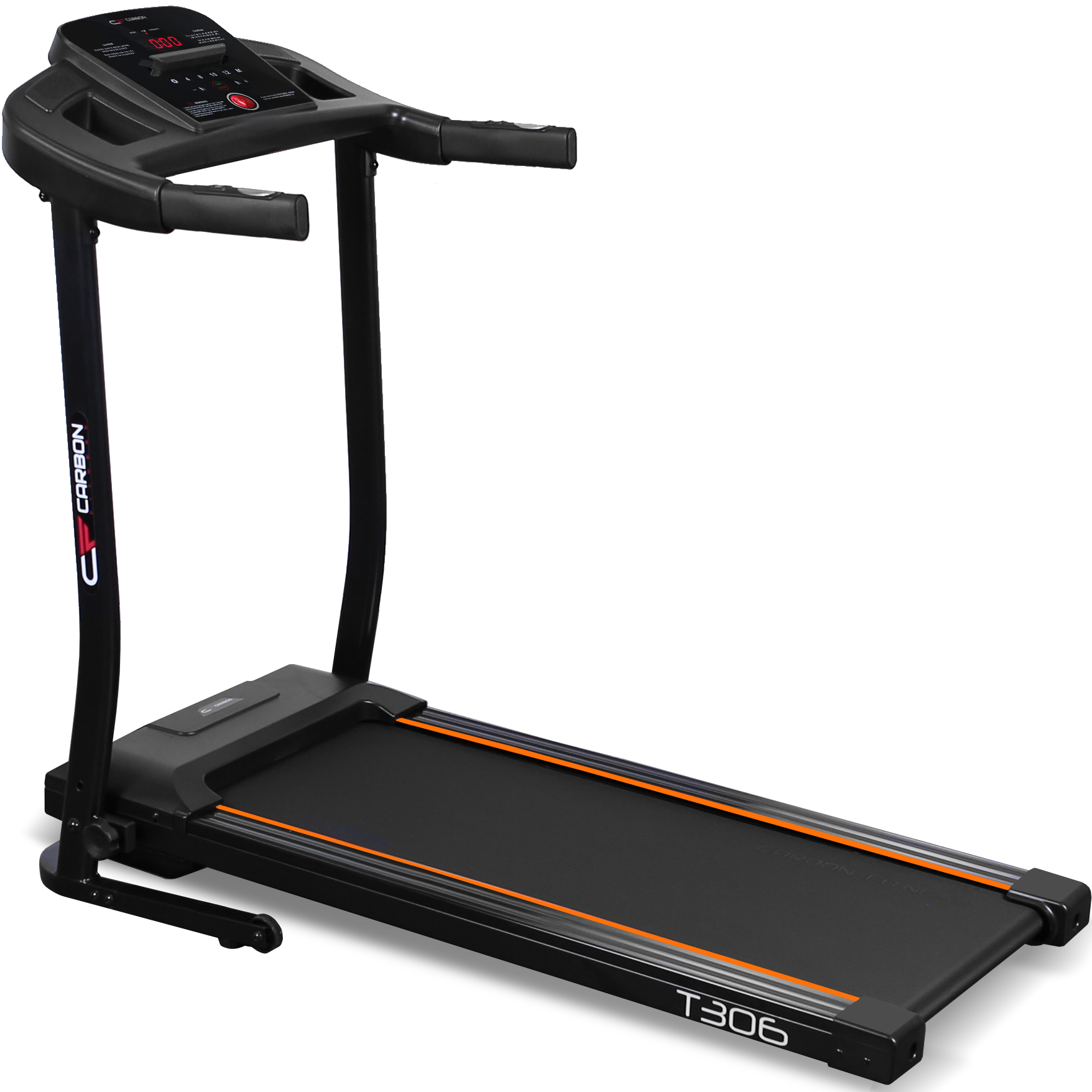 У модели CARBON FITNESS Т306 есть 2 основных и 2 дополнительных компенсатора неровностей пола, за счет чего тренажер легко привести в нужное положение. Перемещение оборудования происходит за счет 2-ух транспортировочных роликов. Все показания тренировочного процесса размещены на ярком буквенно-цифровом LED-дисплее. Данные видно при любом освещении. В памяти консоли содержится 15 встроенных программ, в которых используются различные виды тренировок. На консоли есть удобные быстрые клавиши контроля скорости бегового полотна, а также старта и окончания тренировки. Приятной опцией является подставка под планшет, с помощью которой можно разнообразить однотипные тренировки за просмотром фильма или сериала.