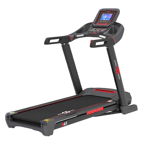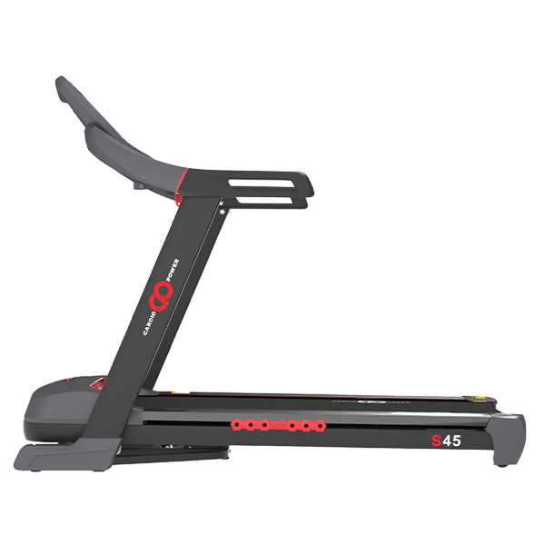 CardioPower S45 - стильная и функциональная беговая дорожка для занятий в домашних условиях. Самые современные технологии, усиленная рама и качественные комплектующие обеспечивают надежную эксплуатацию и отличные технические характеристики.ИДЕАЛЬНЫЕ ВОЗМОЖНОСТИ ДЛЯ ИНТЕНСИВНЫХ ТРЕНИРОВОКМаксимальная скорость бега до 18 км/ч, шаг изменения 0,1 км/ч;Автоматически регулируемый угол наклона до 18 градусов обеспечивает высокую вариативность интервальных тренировок с углом наклона;Большое беговое полотно 150 х 50 см создает комфортные условия для бега;Мощный электродвигатель 3,0 л.с. с пиковой мощностью 4,0 л.с. от NNNSE CO., LTD. с максимально тихим и плавным ходом;усиленная стальная рама, ударопрочный пластик и высококачественная MDF дека 18 мм выдерживают условия интенсивной эксплуатации пользователям с весом до 150 кг.ПРОДУМАННЫЙ ФУНКЦИОНАЛ ДЛЯ КОМФОРТНЫХ ТРЕНИРОВОКУдобная консоль с клавишами быстрого управления и широким 8-ми дюймовым LCD дисплеем с мягкой голубой подсветкой предоставляет полную информацию о текущих показателях тренировки: скорость, время, расстояние, калории, угол наклона, частота пульса, выбранная программа;12 целевых программ для максимальной мотивации и результативности тренировок;Возможность подключения любимой музыки через MP3 и встроенной акустической систему;Bluetooth для подключения внешних устройств;Держатель для планшета, зарядка USB, держатель для бутылки и вентилятор для создания комфортных условий во время тренировки;Легкий и удобный гидравлический механизм складывания SmartFold с функцией плавного опускания позволяет быстро и безопасно сложить беговую дорожку до максимально компактного размера, а транспортировочные ролики без усилий переместить в случае необходимости.СТАНДАРТ НАДЕЖНОСТИ И БЕЗОПАСНОСТИУсиленная конструкция рамы;Высокая надежность комплектующих и качество сборки по самым передовым технологиям;Инновационная система амортизации AirCushion с эластомерами снижает нагрузку на суставы, делая тренировки максимально безопасными;Контроль пульса: Встроенные сенсоры пульса и возможность подключения кардиопояса обеспечивают точный контроль над сердечным ритмом.