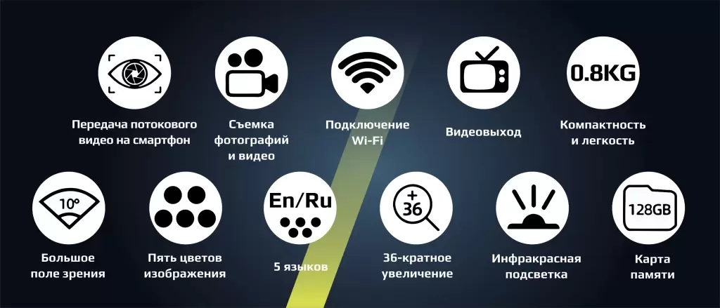 В окуляре ночного прицела расположен микродисплей с диагональю экрана 0,4 Дюйма, передающий картинку в HD качестве с разрешением 1280х720 пикселей. Пользователям доступны широкие настройки контраста и яркости изображения, а также корректировка диоптрий в пределах ±5 дптр. Выходной зрачок вынесен на расстояние 40 мм.