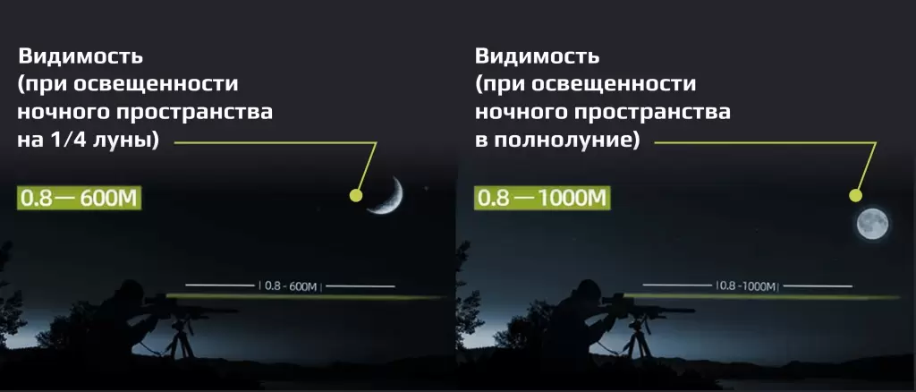 Предельно высокая чувствительность CMOS-сенсора (0,002 lux) обеспечивает возможность обнаружения объектов на расстояниях до 1000 метров при полной Луне. При наиболее слабой освещенности, эквивалентной ¼ Луны, дальность обнаружения составит примерно 600 метров. В условиях полной темноты рекомендовано активировать ИК-осветитель.