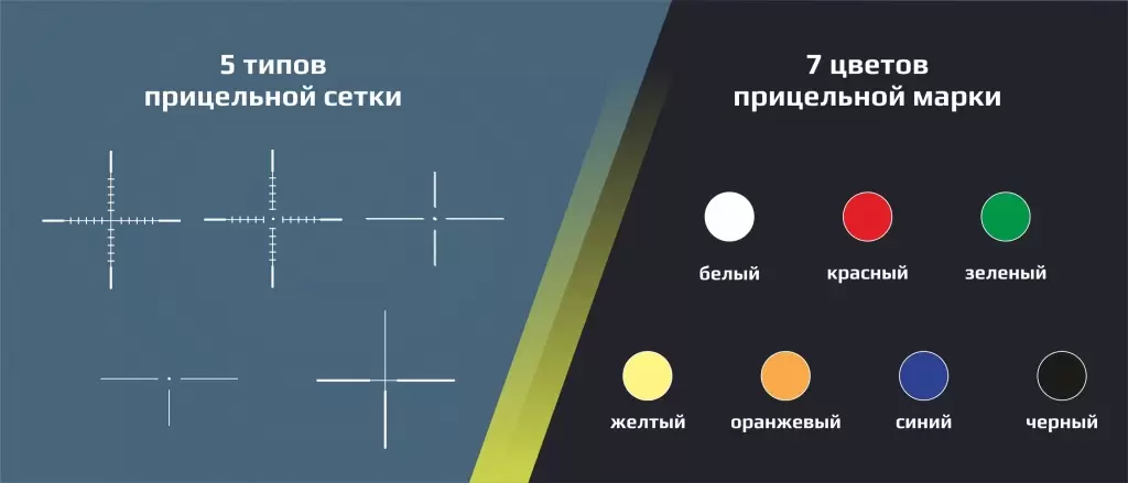 - Пять прицельных сеток со сменой цвета подсветки, пристрелка одним выстрелом.