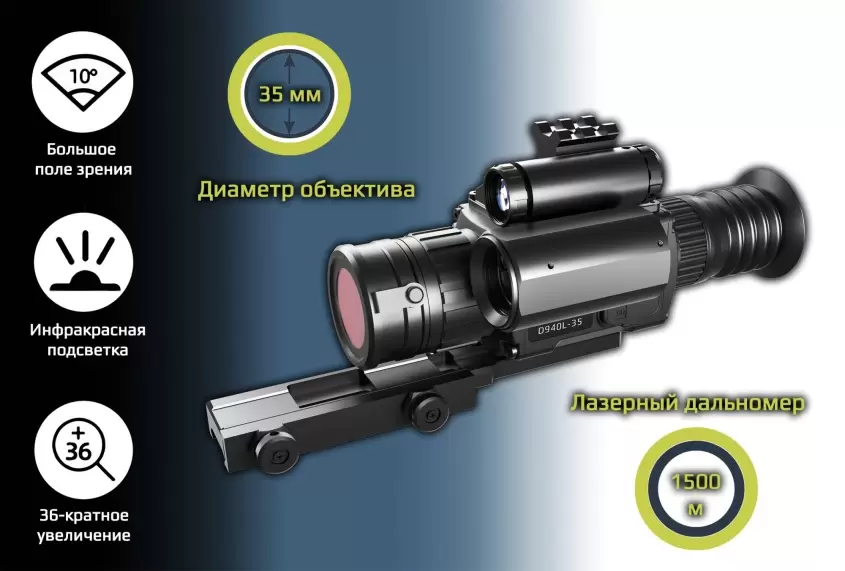 Прицел оснащен объективом с фокусным расстоянием 35 мм и апертурой f1.0. Начальное увеличение составляет 3.5 крат. Приблизить картинку можно цифровым способом в пределах х1 –х6. Угол поля зрения (FOV) равна 17°.