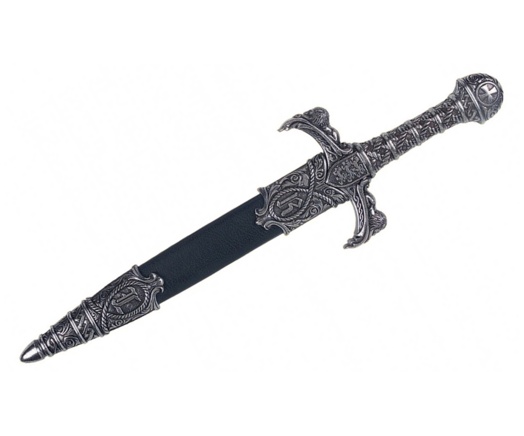 Макет DE-4157-NQ от испанского бренда Denix представляет собой отлично выполненную копию легендарного холодного оружия. В качестве материала используются цинковый сплав и никель. Кинжал имеет эффектные гравировки: на гарде изображен символ крестоносцев – крест, а также герб королевского рода, на ножнах кинжала - вензели с именем владельца. Клинок кинжала граненый, общая длина составляет 45 см. В ножнах черного цвета оружие выглядит очень эффектно и создает впечатление настоящего боевого экземпляра, который использовался в бою вместе с рыцарским мечом.