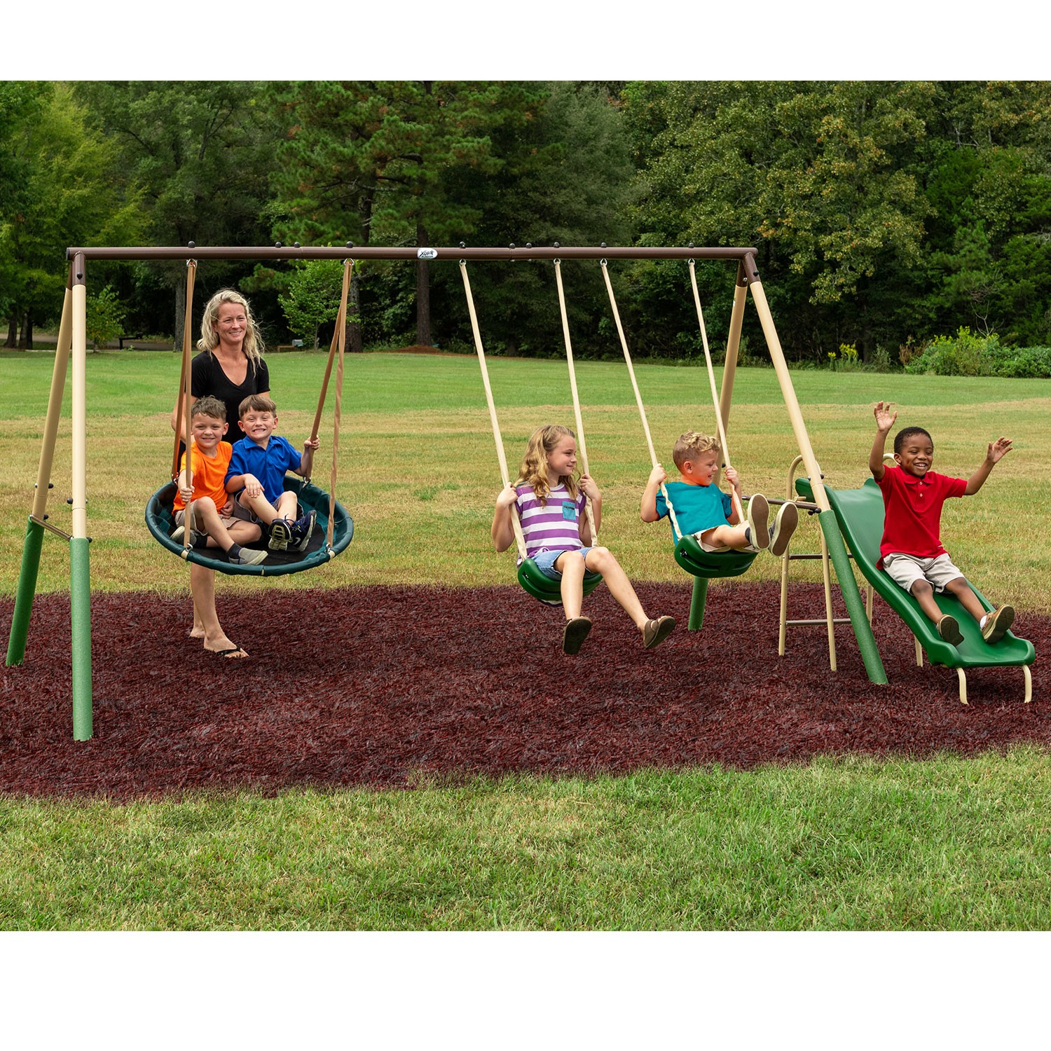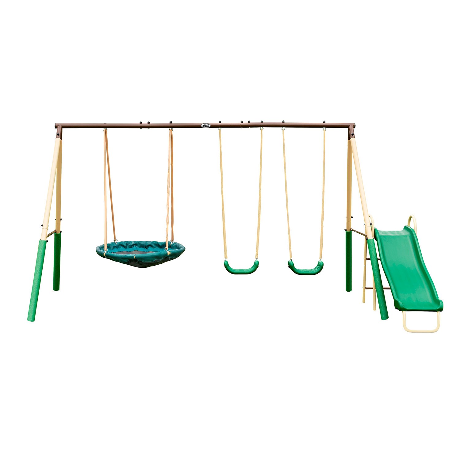 Качели и горка изготовлены из пластмассы, устойчивой к воздействию солнечных лучей.