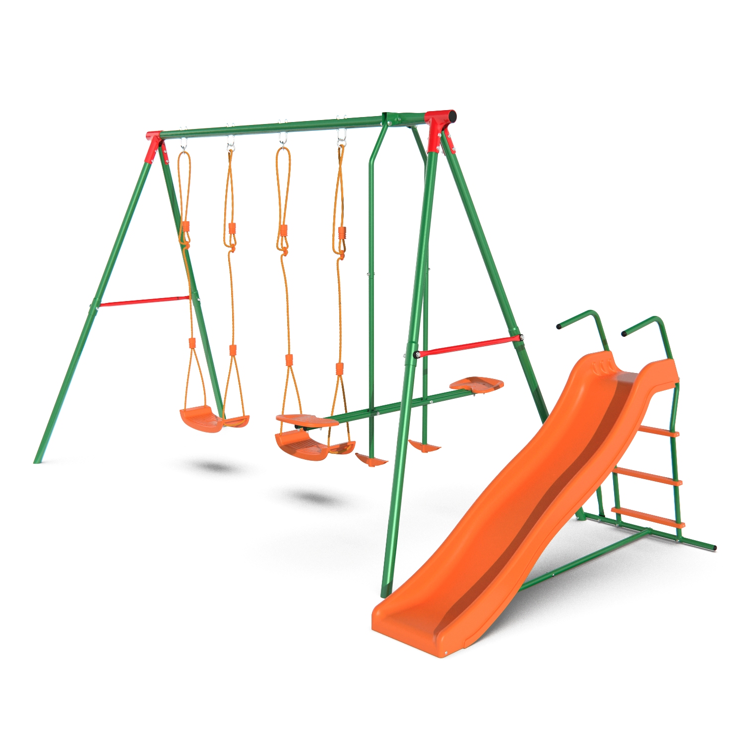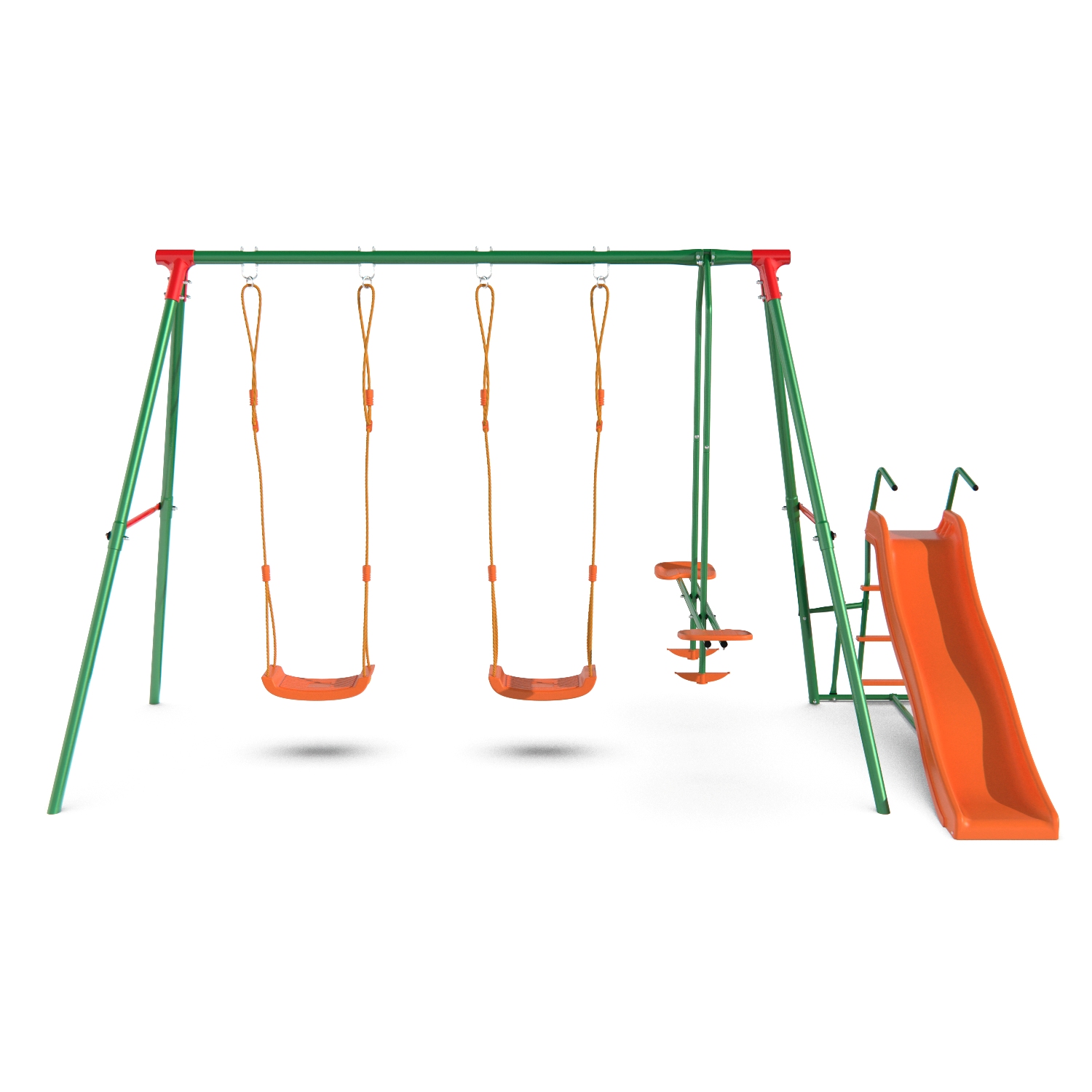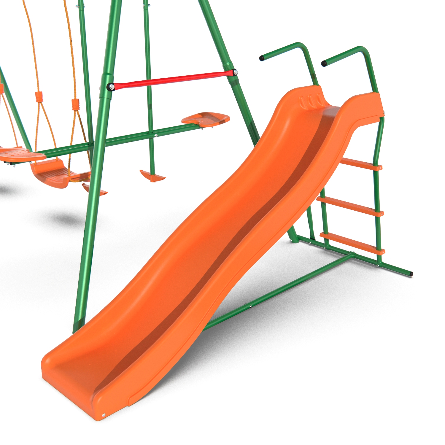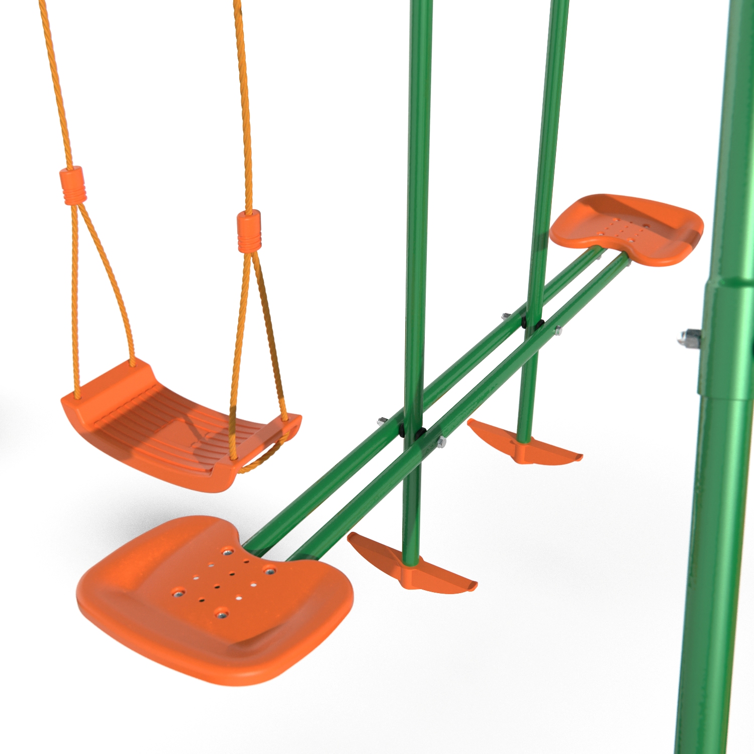 Спускной желоб и сидение качелей изготовлены из пластика.