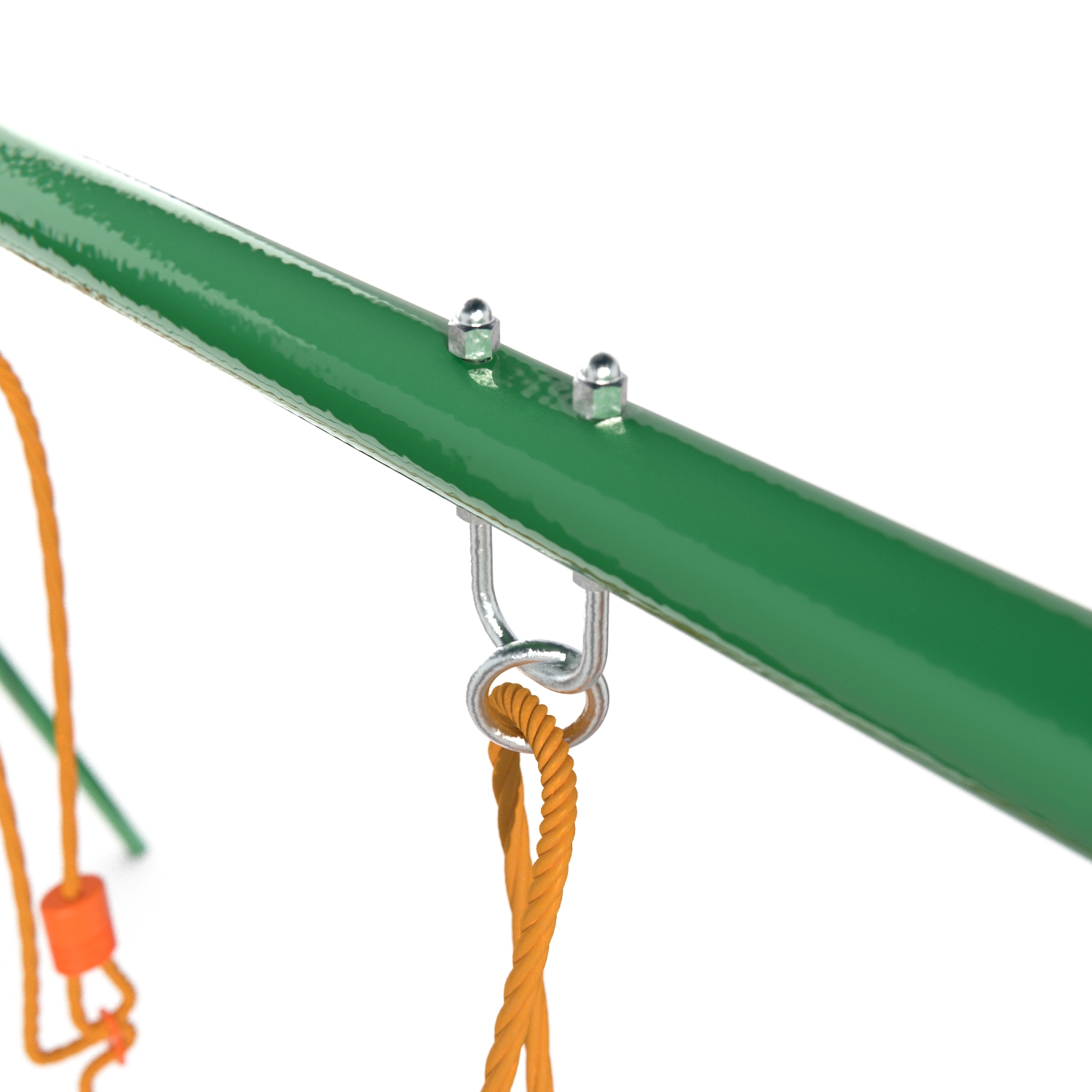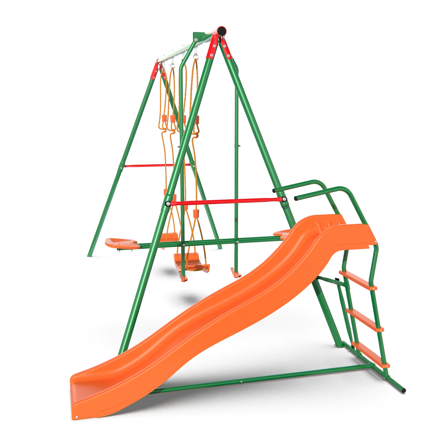 Комплекс включает в себя: веревочные качели (2 шт), двухместные качели и горку.