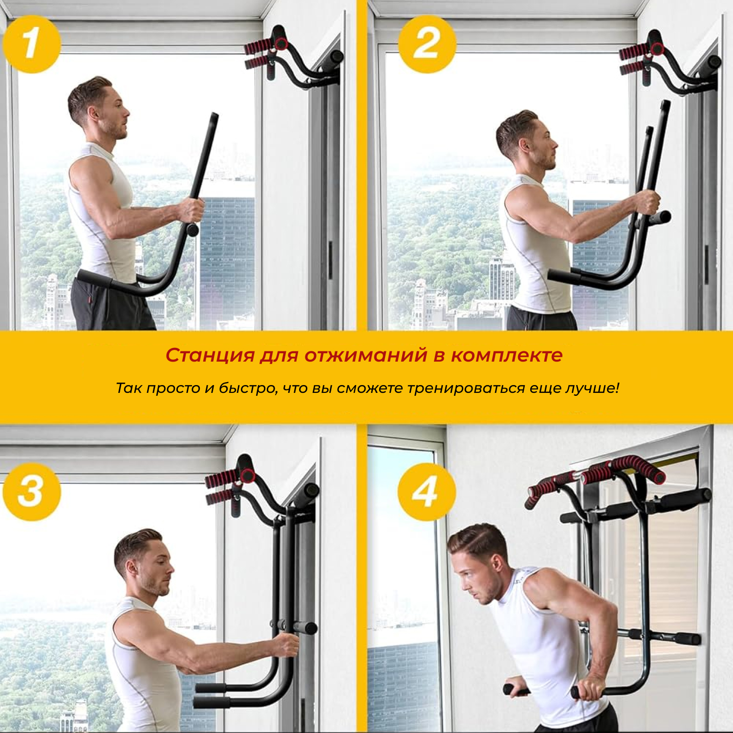 Турник позволяет выполнять широкий спектр упражнений — от подтягиваний различными хватами до отжиманий на брусьях и упражнений на растяжку. Благодаря регулируемому положению станции для отжиманий можно индивидуально подобрать оптимальную высоту и угол, обеспечивая максимальный комфорт и эффективность тренировки.
