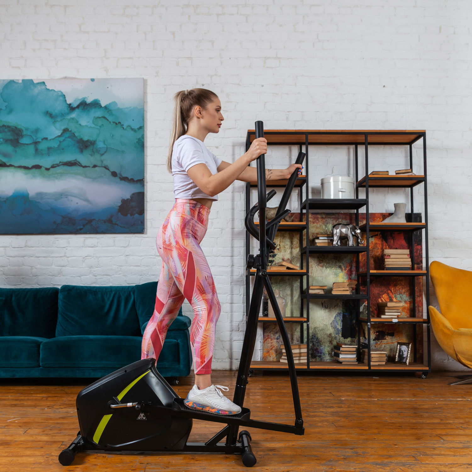 Среднегабаритный эллиптический тренажер для домашнего использования. Тренажер с высокоскоростным маховиком и магнитной системой нагружения. Механическая регулировка нагрузки, 8 фиксируемых положений нагрузки с помощью удобной ручки на стойке тренажера. На руле расположены 2 датчика пульса с отображением показаний на дисплее консоли. Как правило, встроенные на тренажерах датчики имеют погрешность измерения. Поэтому для более точного определения частоты сердечных сокращений (ЧСС) рекомендуем использовать нагрудный кардиопояс с часами - монитором, модель DFC W117 (опция, приобретается отдельно). Встроенные в передней части колеса позволят переместить тренажер по комнате после тренировки. Отсутствие адаптера 220В позволяет разместить тренажер в любом удобном для занятий месте. Запатентованная система двустороннего вращение маховика придает дополнительную плавность и более правильный ход педалей при занятии. Показания консоли: время, скорость, расстояние, калории, пульс, ODO