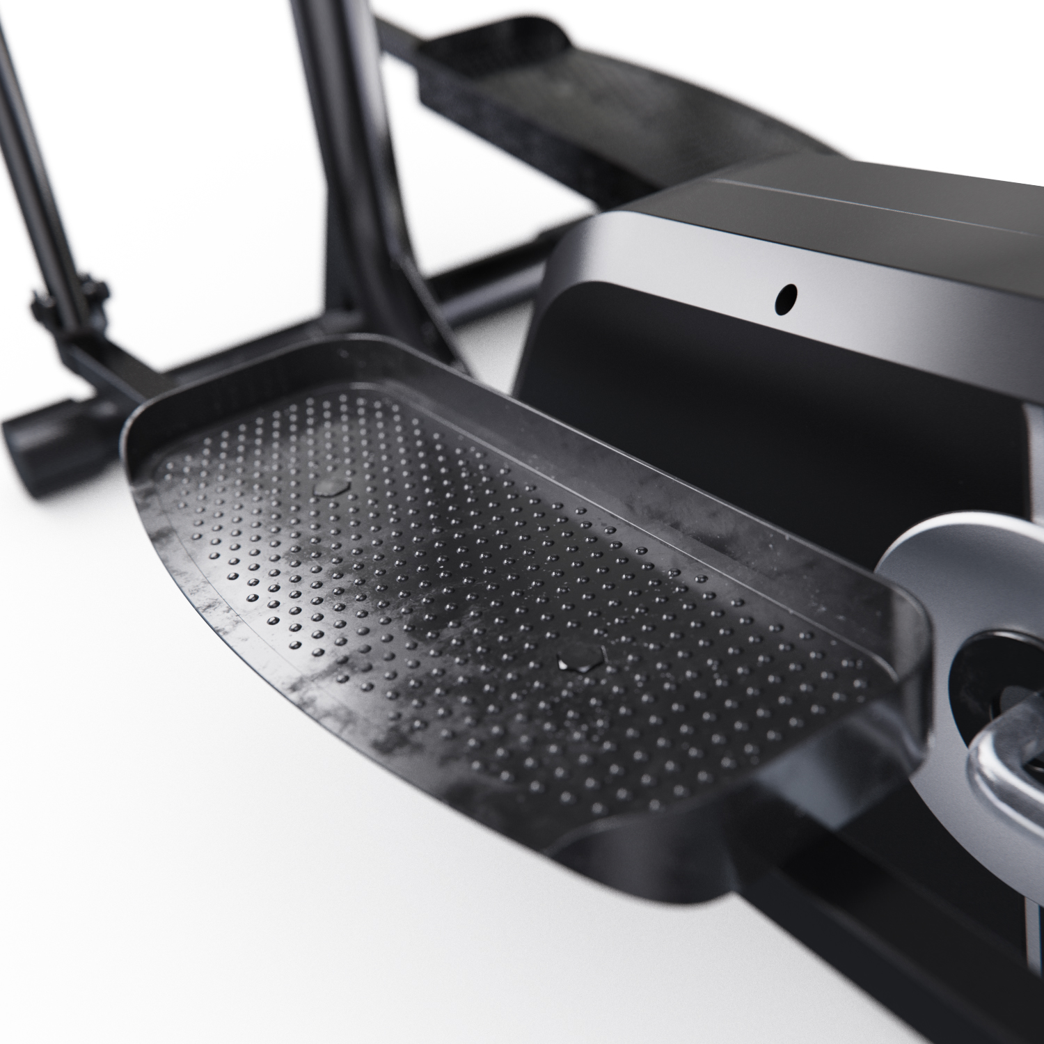 Консоль эллиптического тренажера отображает основные параметры тренировки: время, скорость, пройденное расстояние, сожженные калории и частоту пульса. Для функционирования консоли требуются две батарейки типа ААА (не входят в комплект).