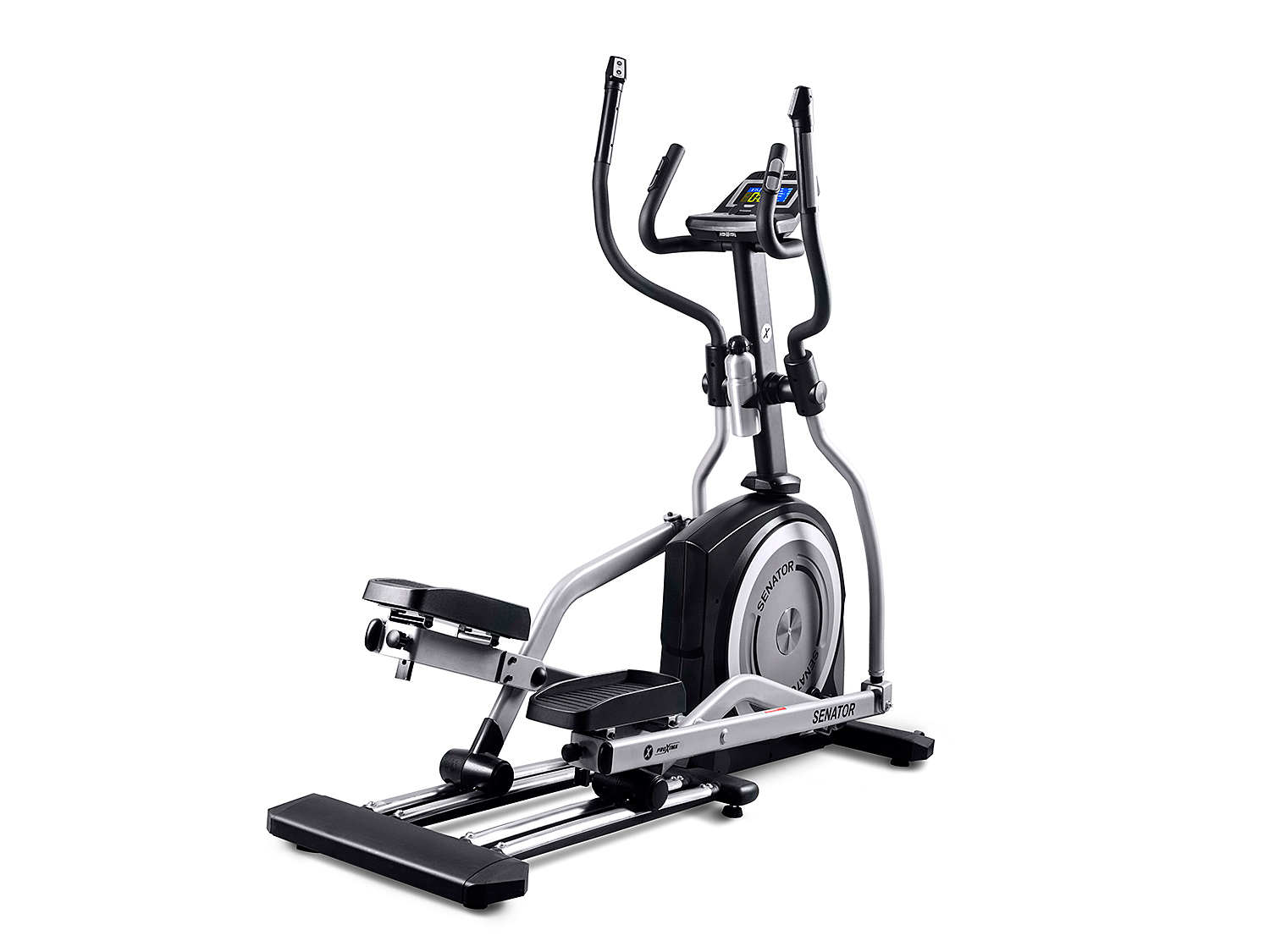 Переднеприводной эллиптический тренажер с генератором Proxima Senator для использования в домашних условиях. Наиболее удобен и комфортен для пользователей. Он устойчивый: оснащен сдвоенными колесами на металлических направляющих и фронтальными стабилизаторами. Минимальный Q-фактор 8 см в сочетании с длиной шага 58 см и высотой шага 23 см позволяет почувствовать естественные беговые движения, а дополнительные мягкие педали подарят вам ощущения мягкости бега. Функция изменения угла наклона педалей «ANKLE SUPPORT»™ фиксирует стопу пользователя в индивидуально комфортном положении и позволяет прорабатывать разные группы мышц за счет перераспределения нагрузки.