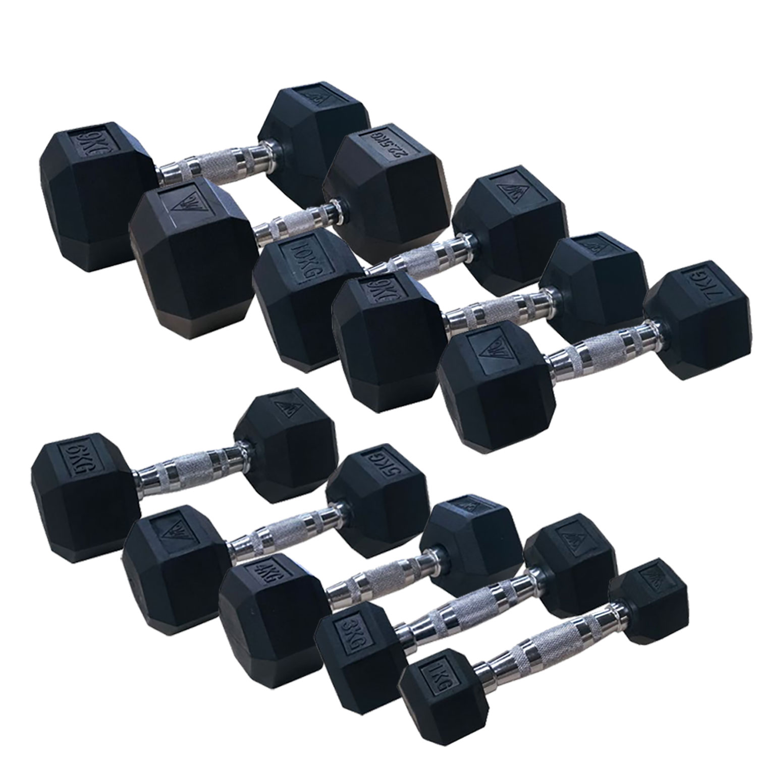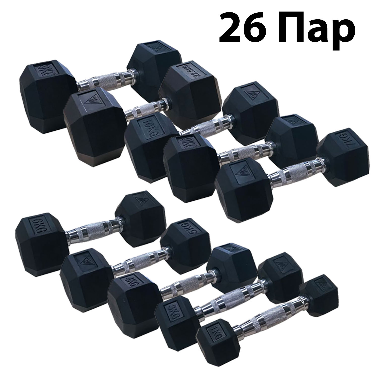 Гантели обрезиненные с хромированной ручкой. Вес гантели от 1 кг до 50 кг с шагом в 1 кг, в комплекте по 2 штуки (пара) каждого веса.
