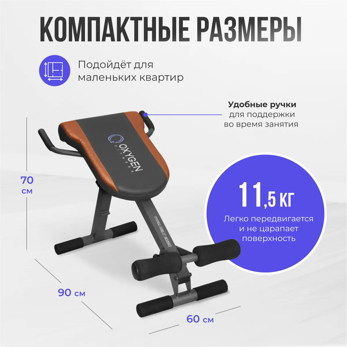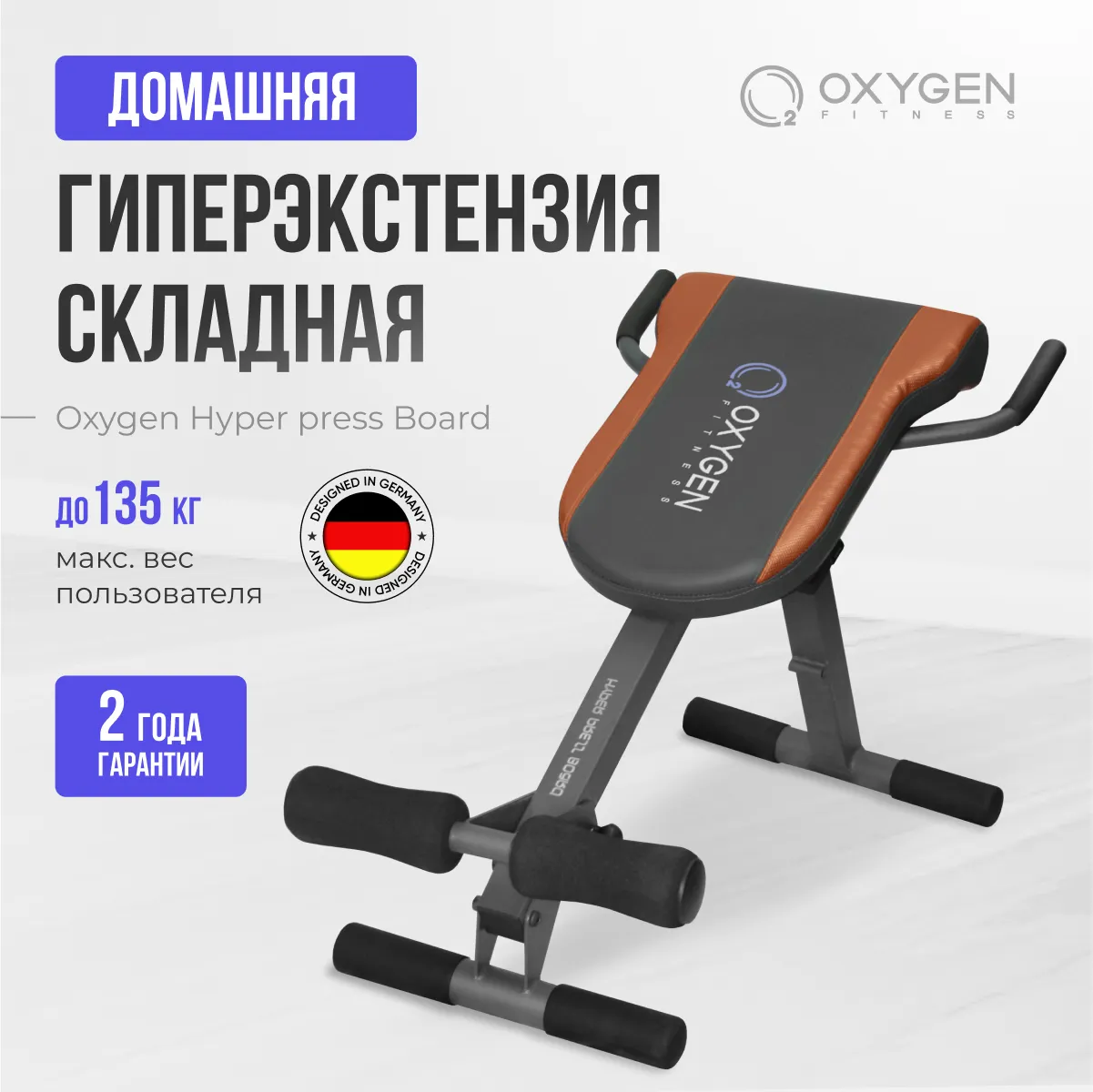 Складная гиперэкстензия Oxygen Hyperpress Board для тренировки мышц пресса и спины. Удобная подушка сидения толщиной 50 мм. позволяет комфортно тренироваться. Высокопрочная стальная рама с профилем 50*50 мм. выдерживает пользователя весом до 130 кг.