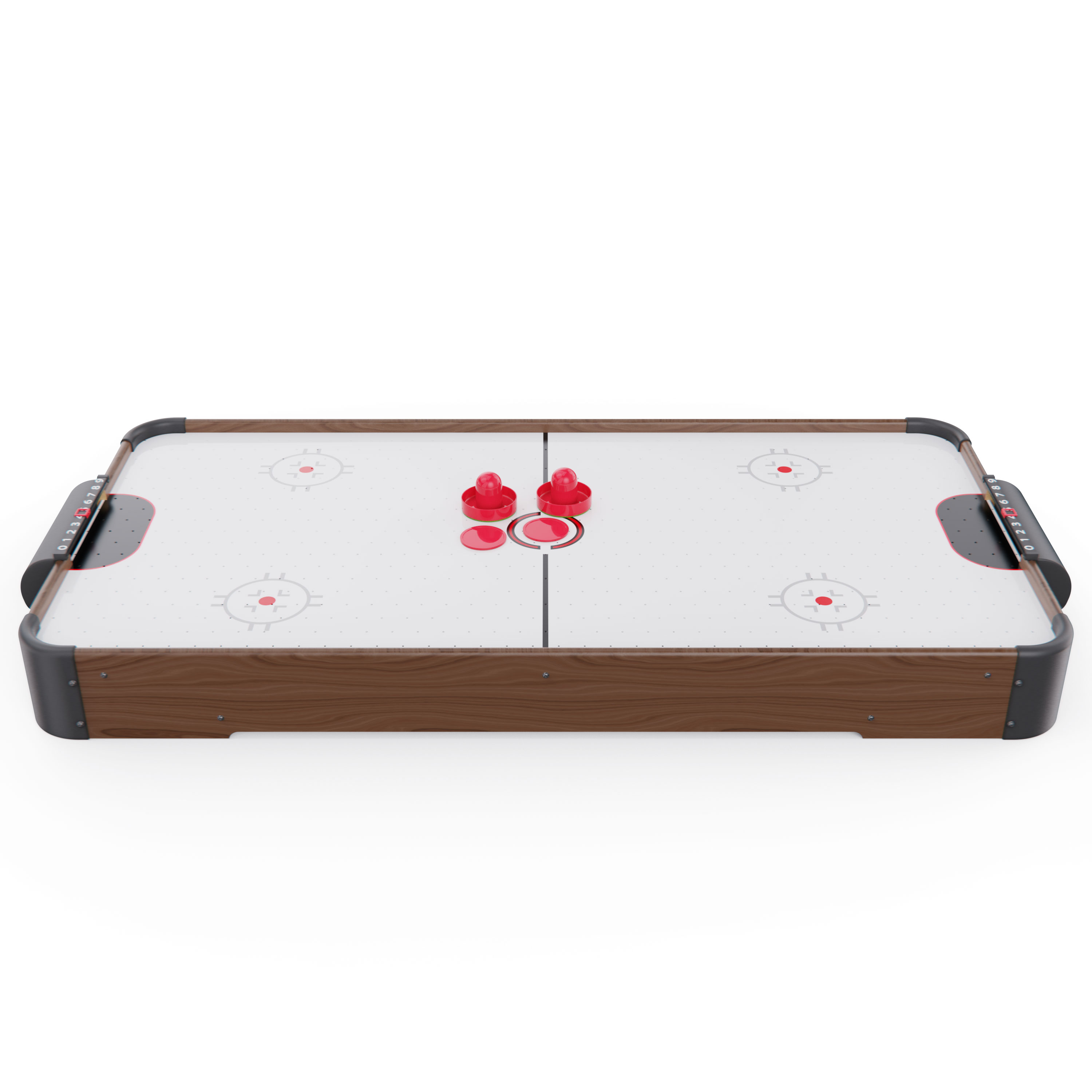 Игровой стол оснащён вентилятором на 220V, создающим воздушную подушку под шайбой. Это обеспечивает лёгкое и быстрое скольжение по полю, делая игру более захватывающей и реалистичной.