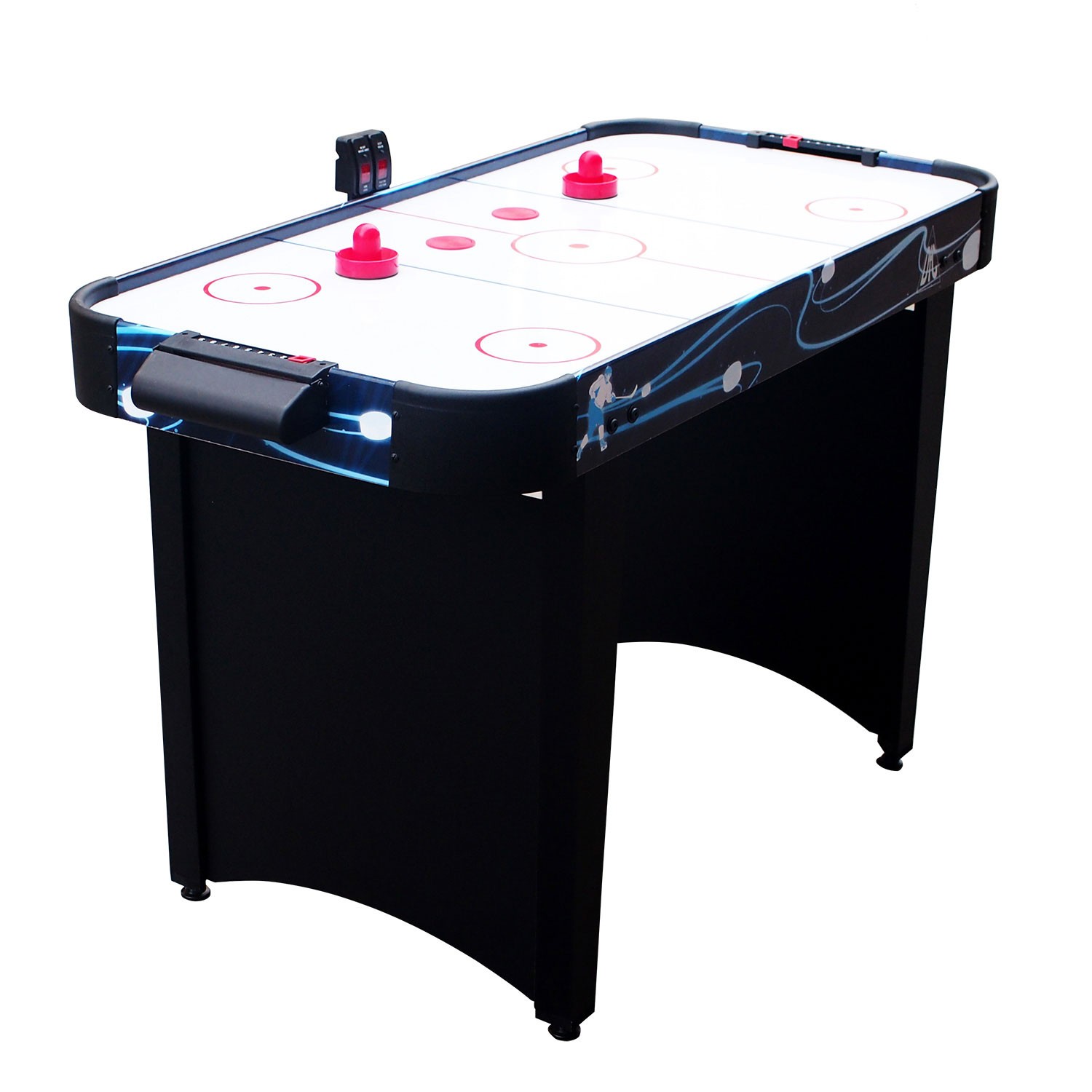 Игровой стол будет не только отличной покупкой для себя, но и прекрасным подарком. Игра в настольный хоккей очень эмоциональная, захватывающая и проходит на больших скоростях. Почувствуйте звуки и атмосферу знаменитой и популярной игры! Настольный хоккей является отличным развлечением дома или на даче. Аэрохоккей ANAHEIM оборудован электронным табло для подсчета очков и механическим счетчиком возле каждого игрока. Комплектуется набором аксессуаров: 2 биты и 2 шайбы красного цвета. Корпус выполнен из специально обработанного МДФ, сверху покрытого прочным ламинатом. Мощный компрессор подает воздух через отверстия по всей поверхности стола. Напряжение: 220В (через адаптер) Размер биты: 75 мм Размер шайбы: 60 мм