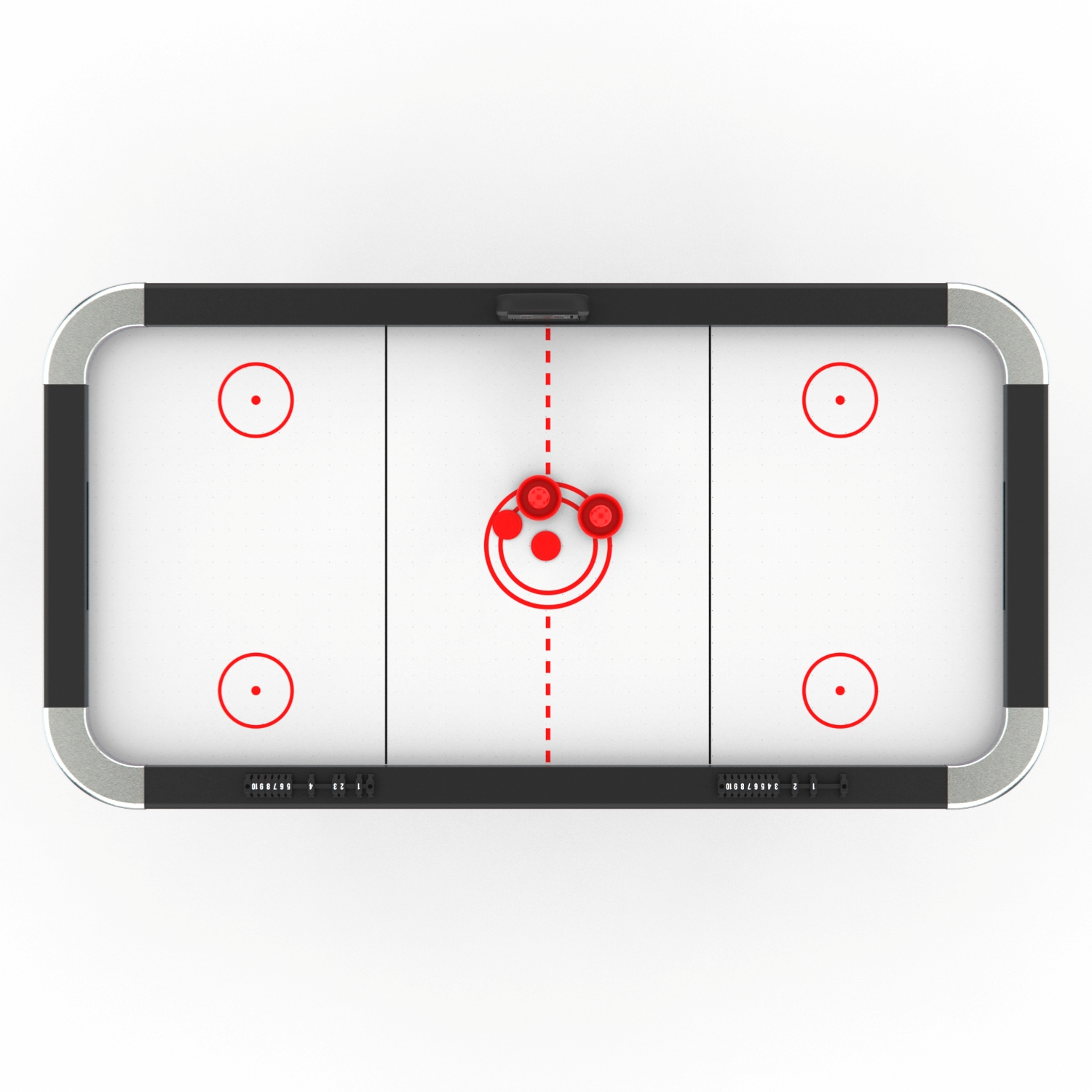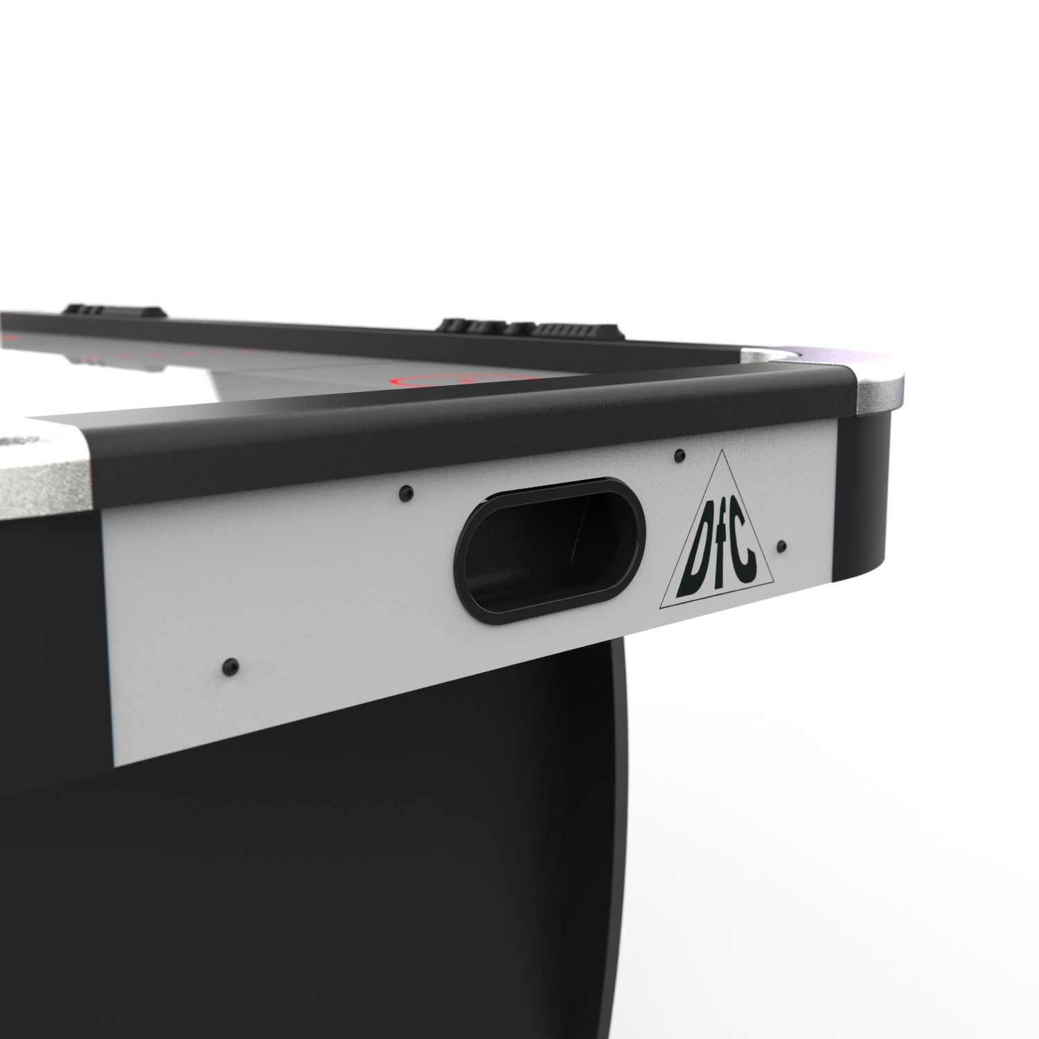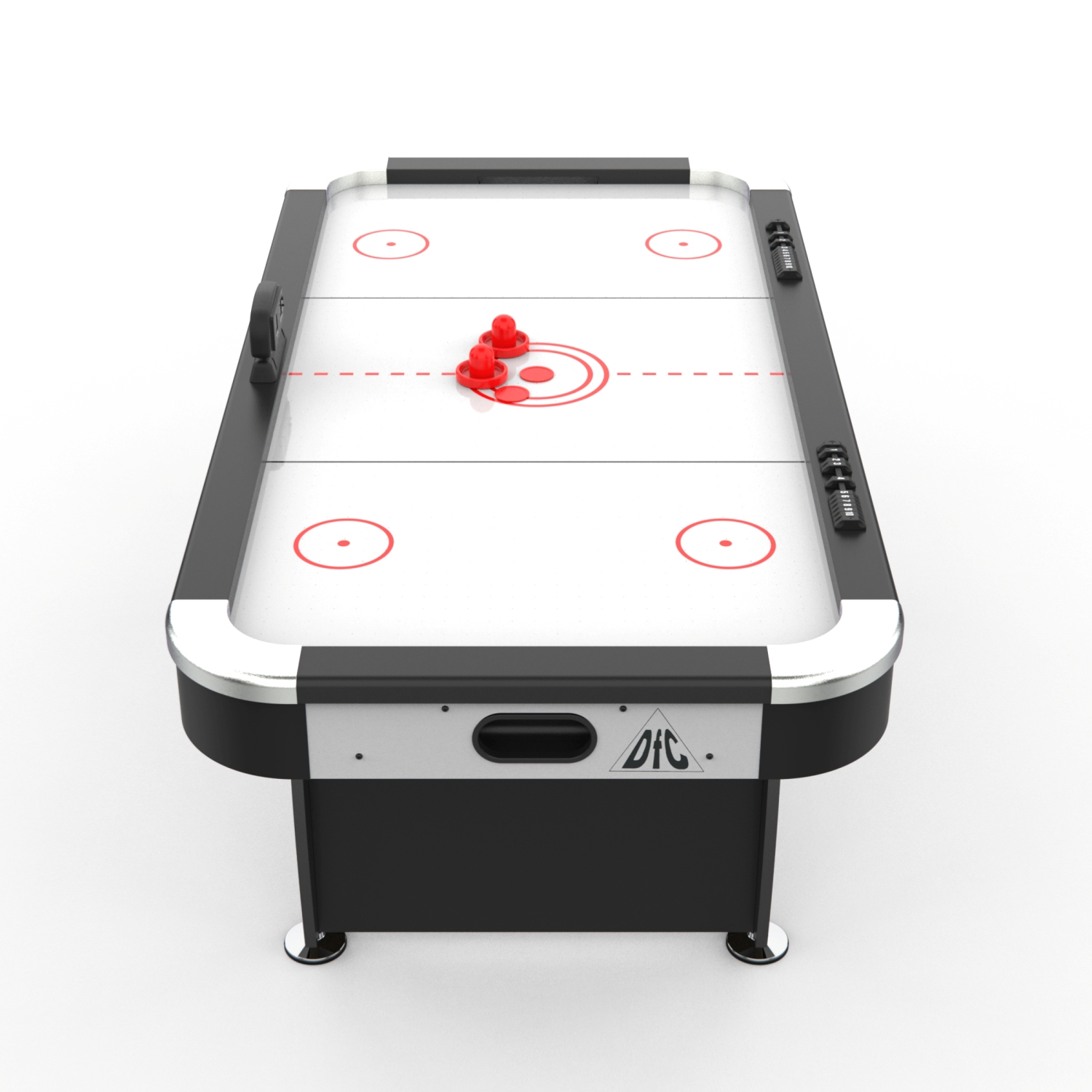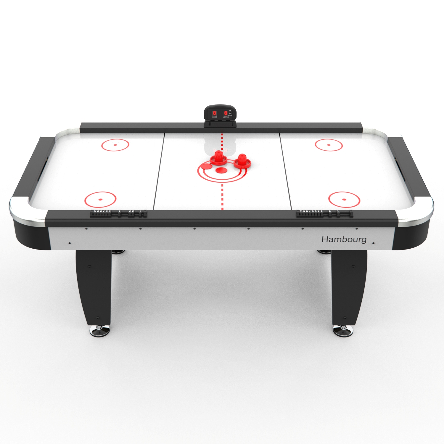 Стол оборудован электронным табло для подсчета очков. Дополнительно у каждого игрока есть механический счетчик забитых шайб. Корпус выполнен из специально обработанного МДФ толщиной 20 мм, сверху покрытого прочной пленкой из ПВХ. Мощный компрессор подает воздух через отверстия. Напряжение: 220В.