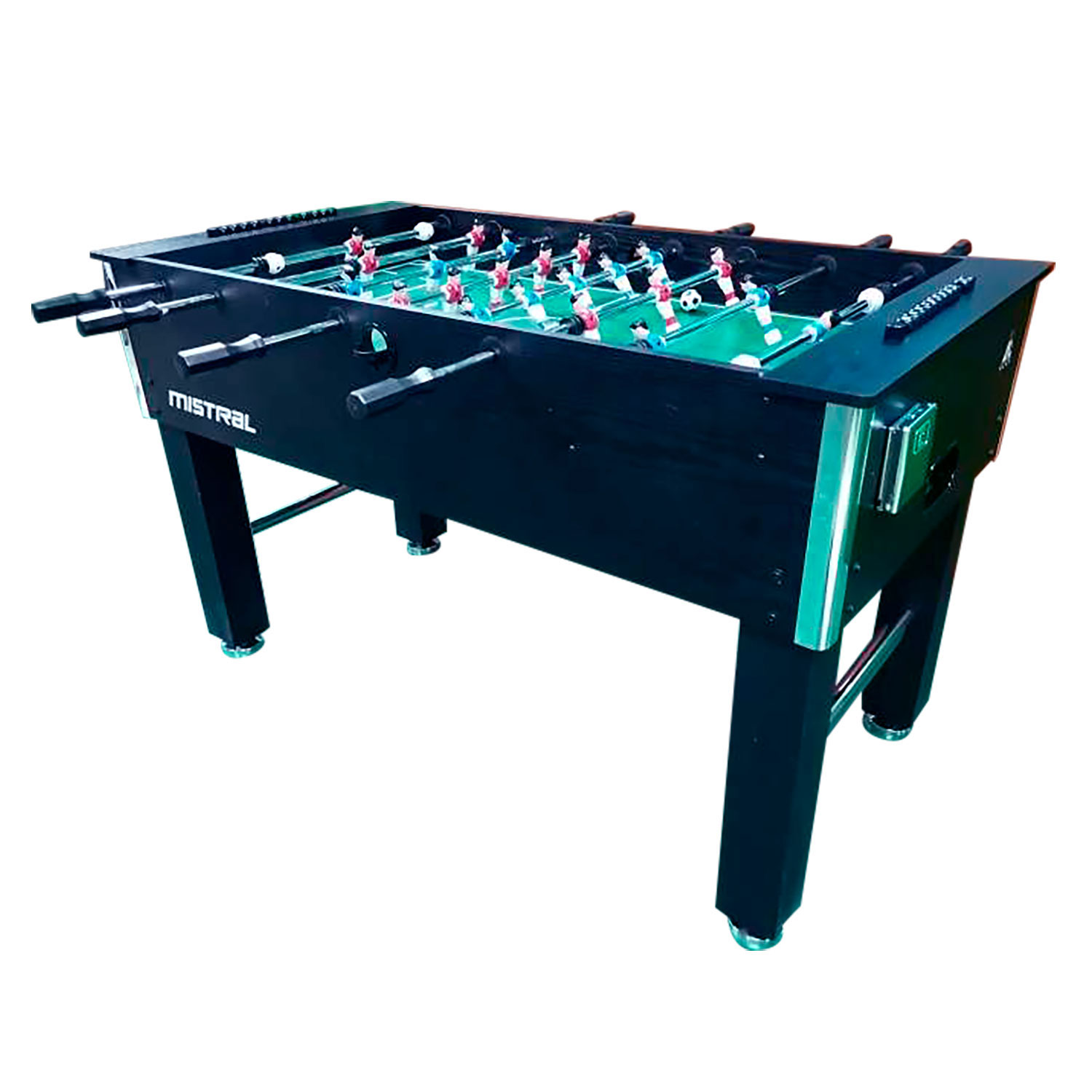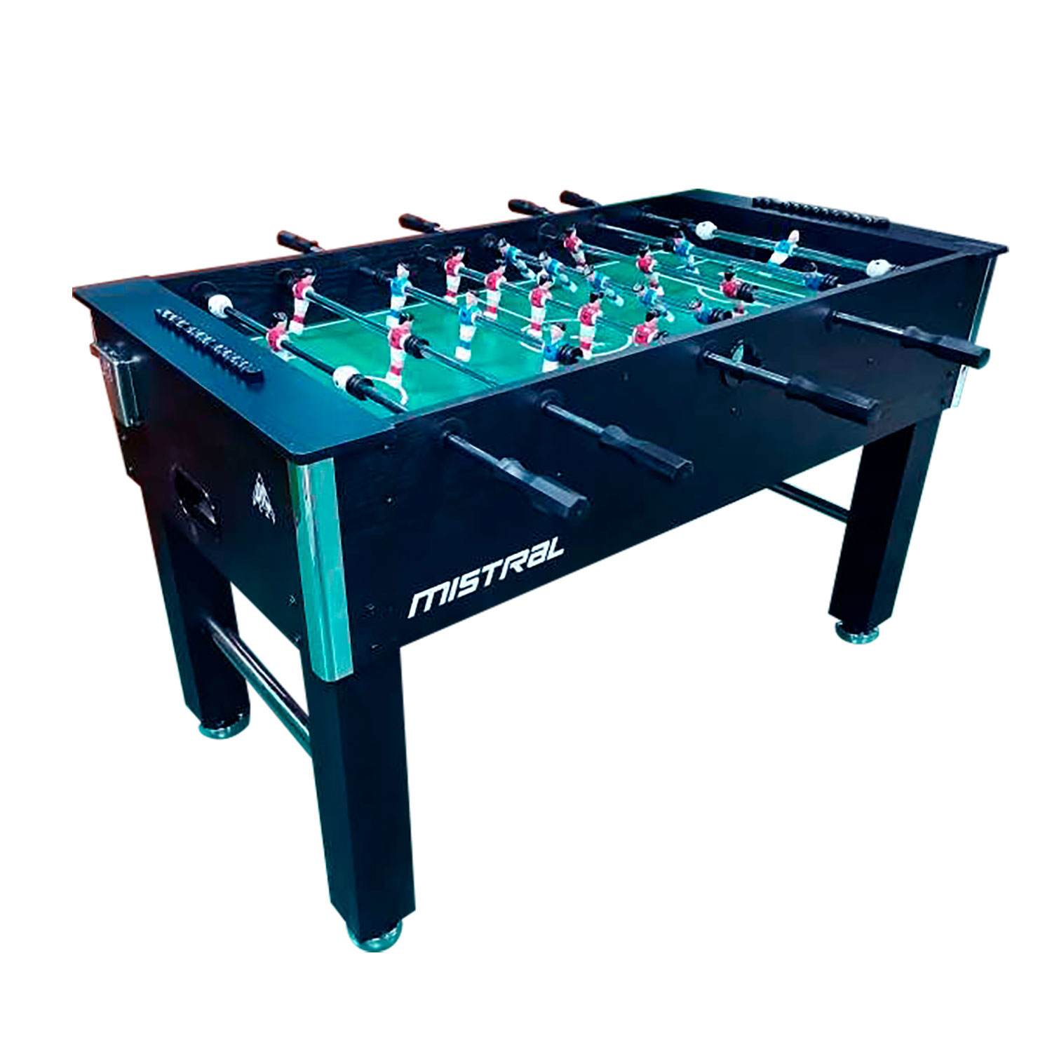 Настольный футбол является отличным развлечением дома или на даче. Игровой стол будет не только отличной покупкой для себя, но и прекрасным подарком. Игра в настольный футбол очень эмоциональная, захватывающая и проходит на больших скоростях. Почувствуйте звуки и атмосферу знаменитой и популярной игры! Представляем новую модель - стол MISTRAL. Корпус стола имеет строгую отделку ламинатом темного цвета "под дерево". Корпус выполнен из специально обработанного МДФ, сверху покрытого прочным пластиком. Стол оборудован механическим табло для подсчета очков для каждого игрока и складным подстаканником для бутылки с водой. Комплектуется набором аксессуаров: 2 мяча Ø31мм.
