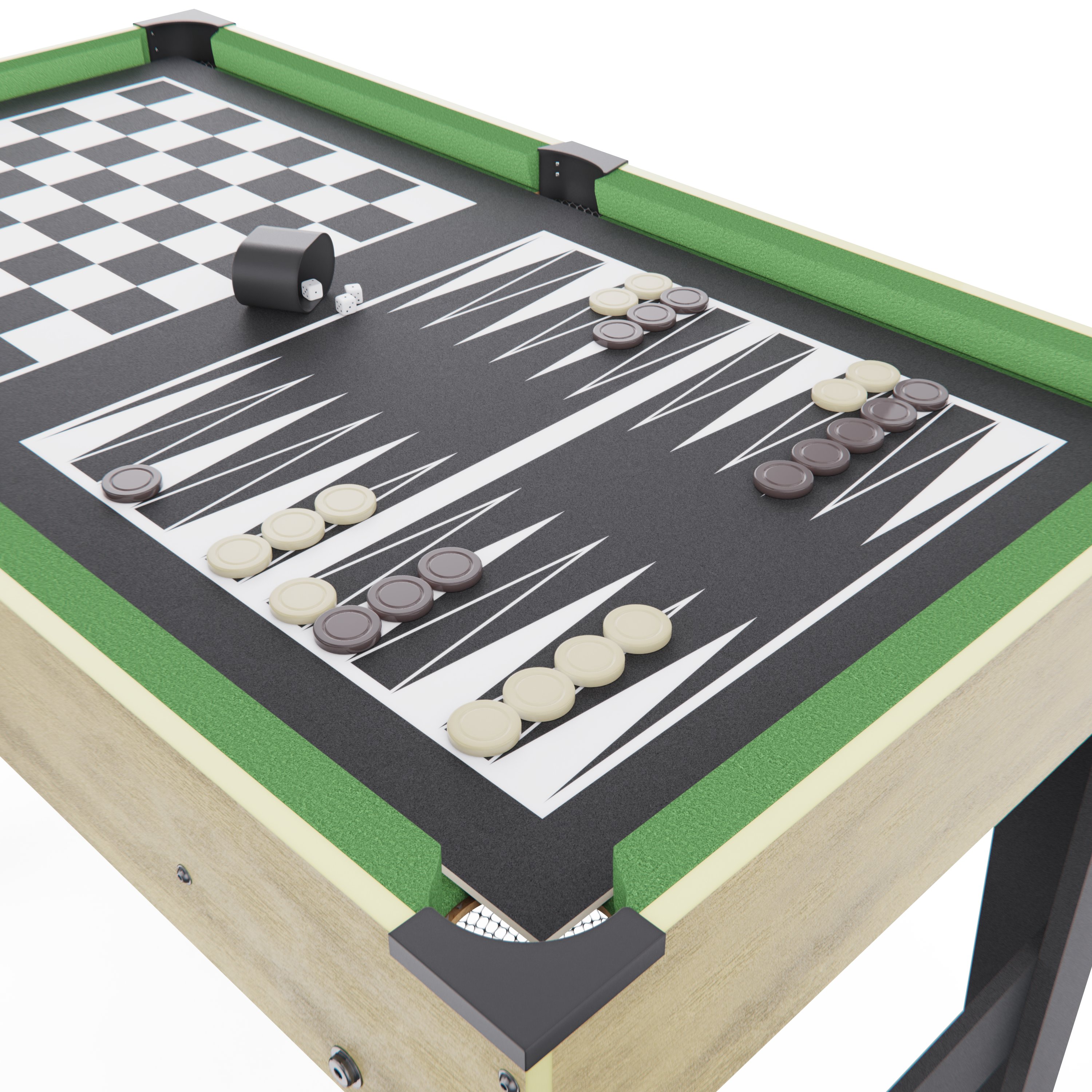 Игровой стол выполнен из МДФ, ПВХ и бархата — практичных и устойчивых к нагрузкам материалов. Конструкция дополнена ножками высотой 63 см, благодаря чему стол устойчиво располагается на поверхности и сохраняет баланс во время игры. Такая высота обеспечивает комфортный игровой процесс и удобство использования.