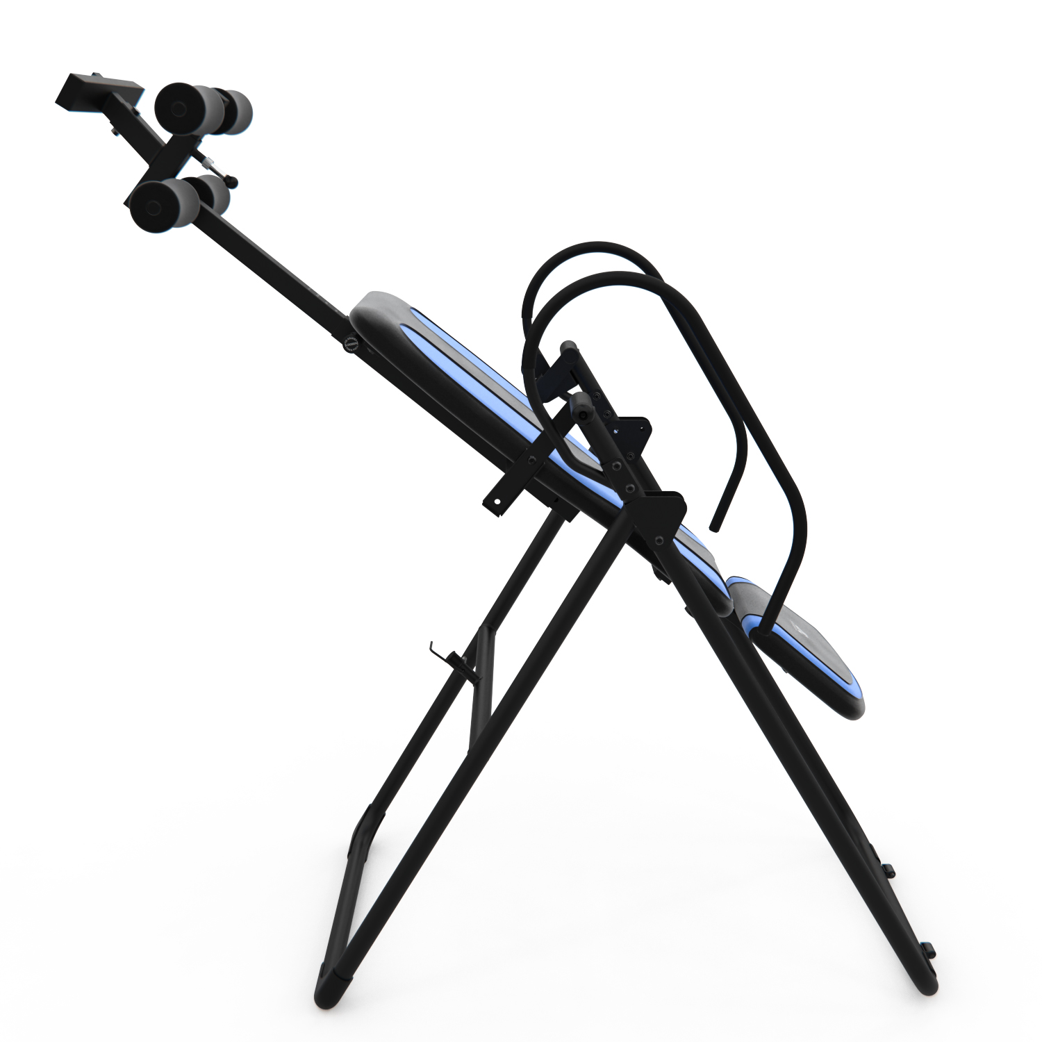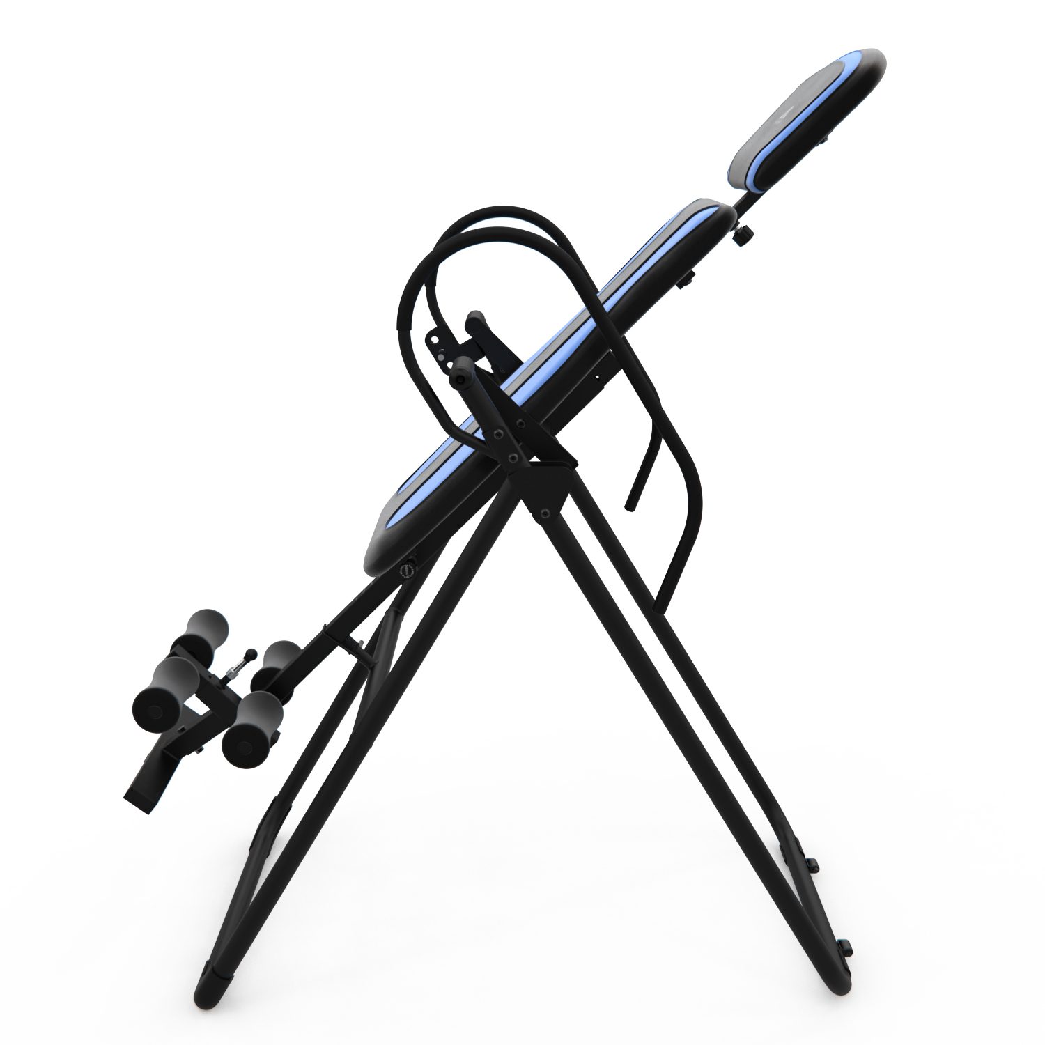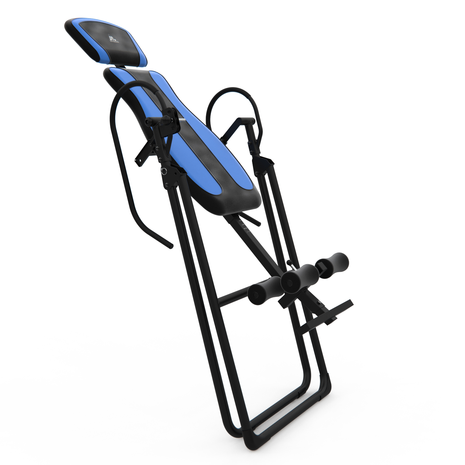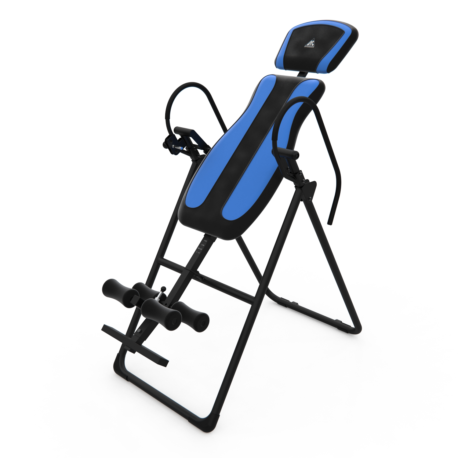 Инверсионный стол IT9750 для домашнего использования. Корпус черного цвета, спинка темно-синяя с яркими синими вставками. Максимальный вес пользователя 120 кг.