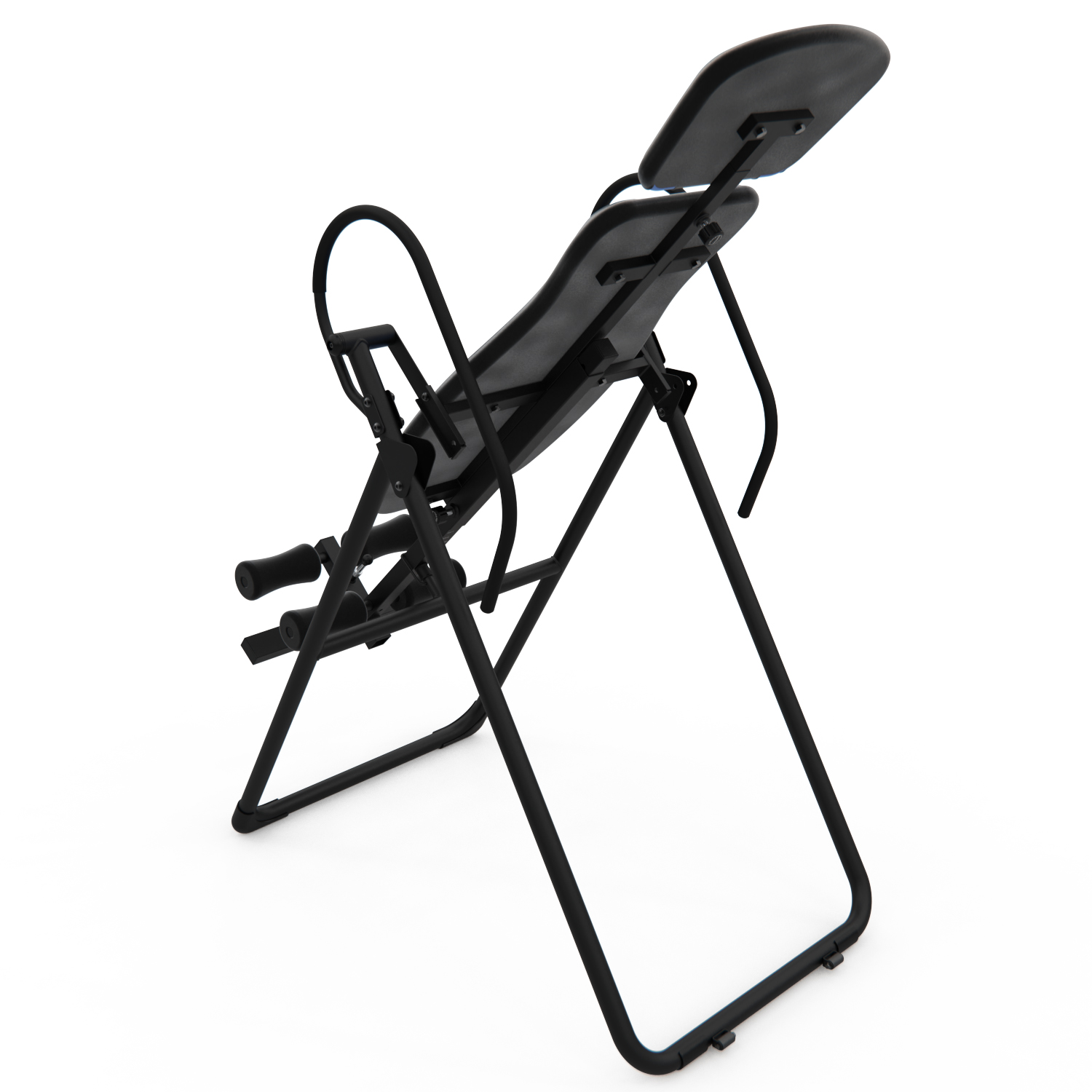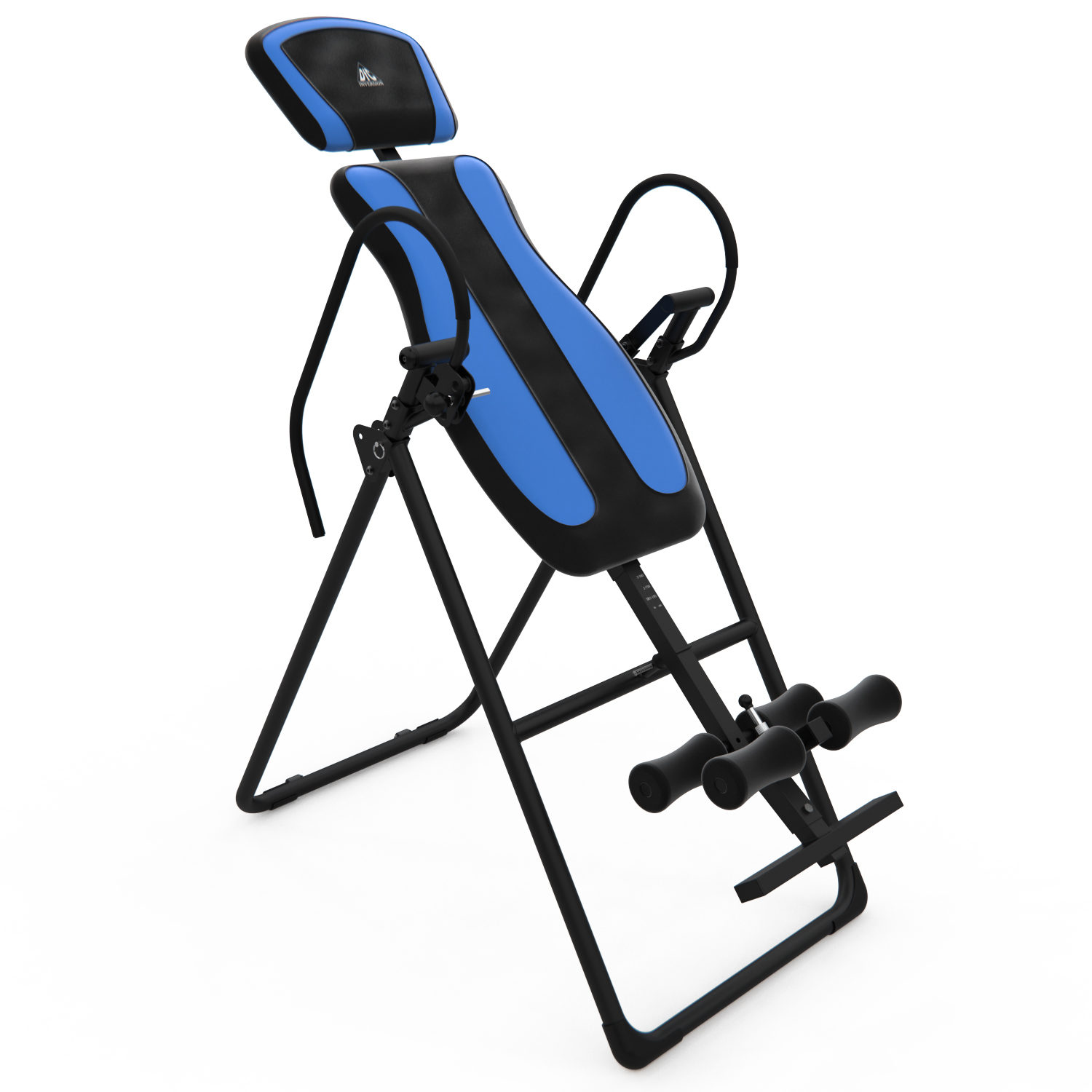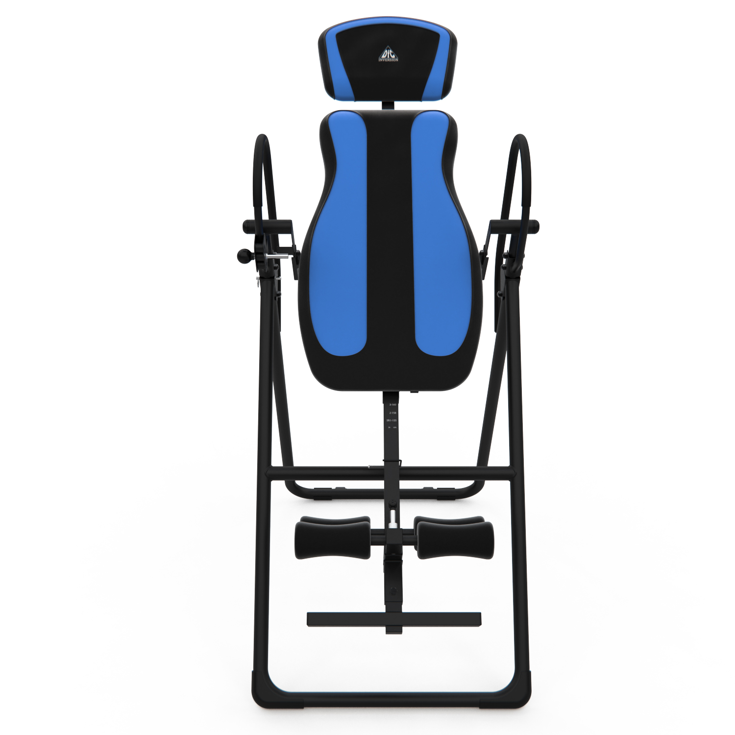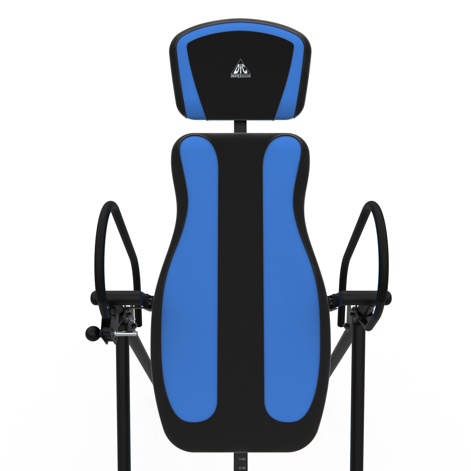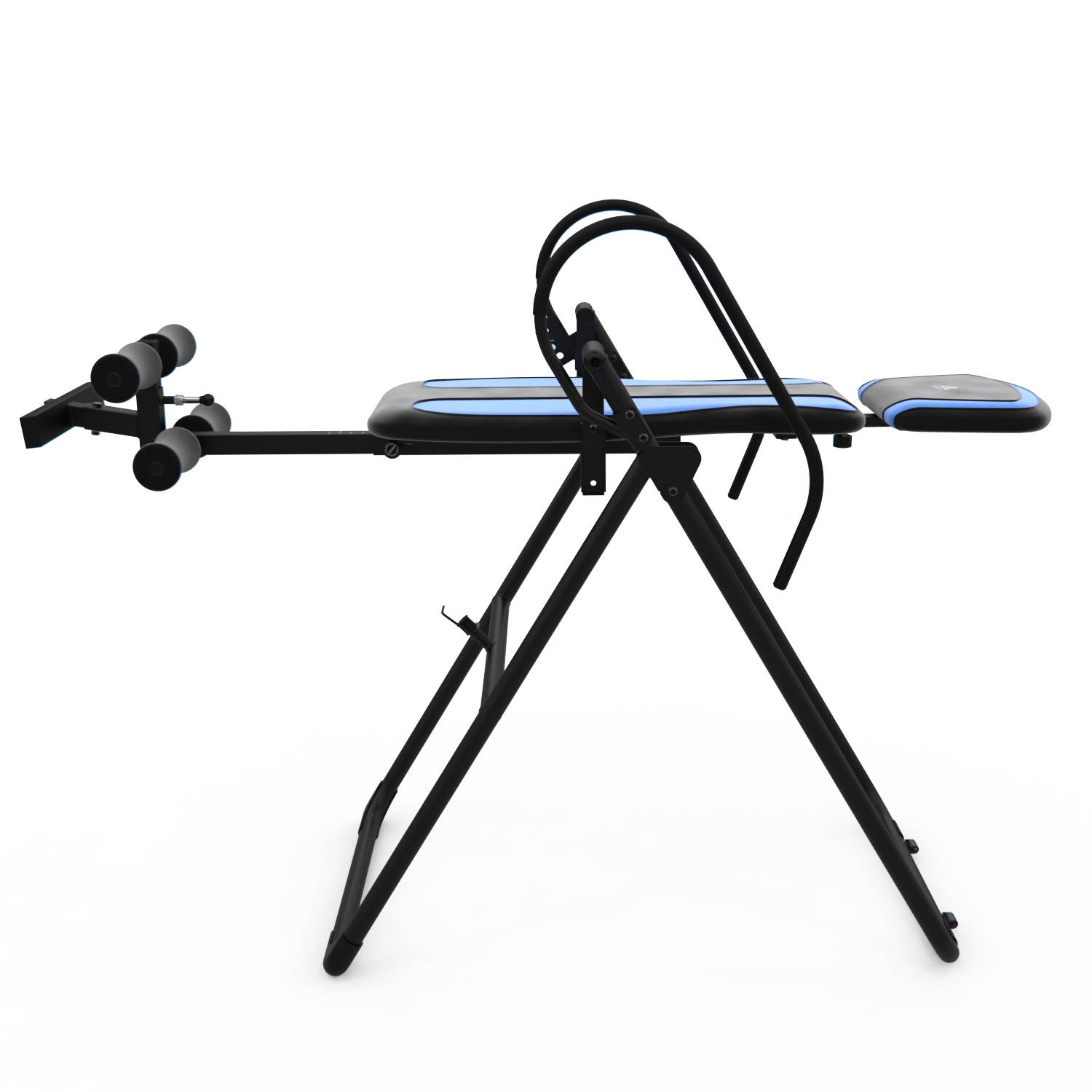 Инверсионный стол IT9750 для домашнего использования. Корпус черного цвета, спинка темно-синяя с яркими синими вставками. Максимальный вес пользователя 120 кг.