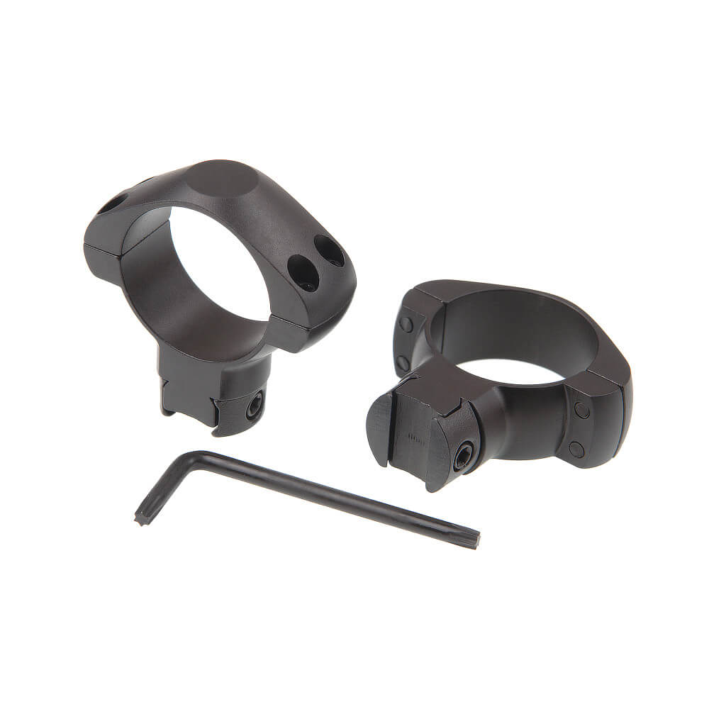Cтальные кольца, высокие, для прицелов диаметром 30 мм, высота установки прицела 27,75 мм, крепление на планку «ласточкин хвост» 11 мм с радиусным посадочным местом.