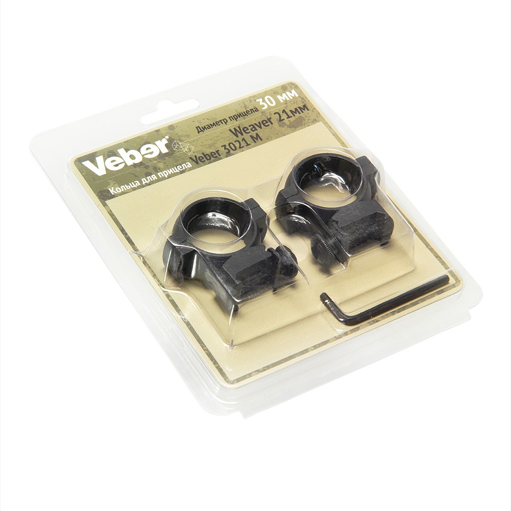 Кольца для прицела Veber 3021 M предназначены для установки оптических прицелов с посадочным диаметром 30 мм на оружие с верхней планкой Weaver. Винты с насечкой, на головке винта прямой шлиц. Кольца изнутри проклеены тонким синтетическим материалом. В комплект входит ключ-шестигранник. Материал всех крепежных элементов — сталь. Детали колец изготовлены из высокопрочного алюминиевого сплава марки 6061-Т6.