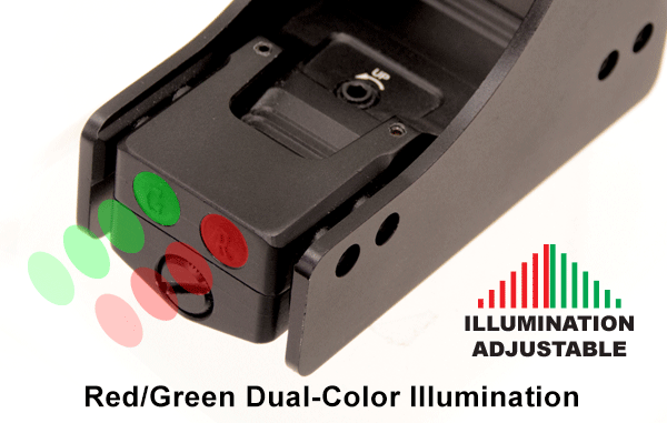 - Прицельная метка «круг с точкой», 2-х цветная подсветка – красный и зелёный;
